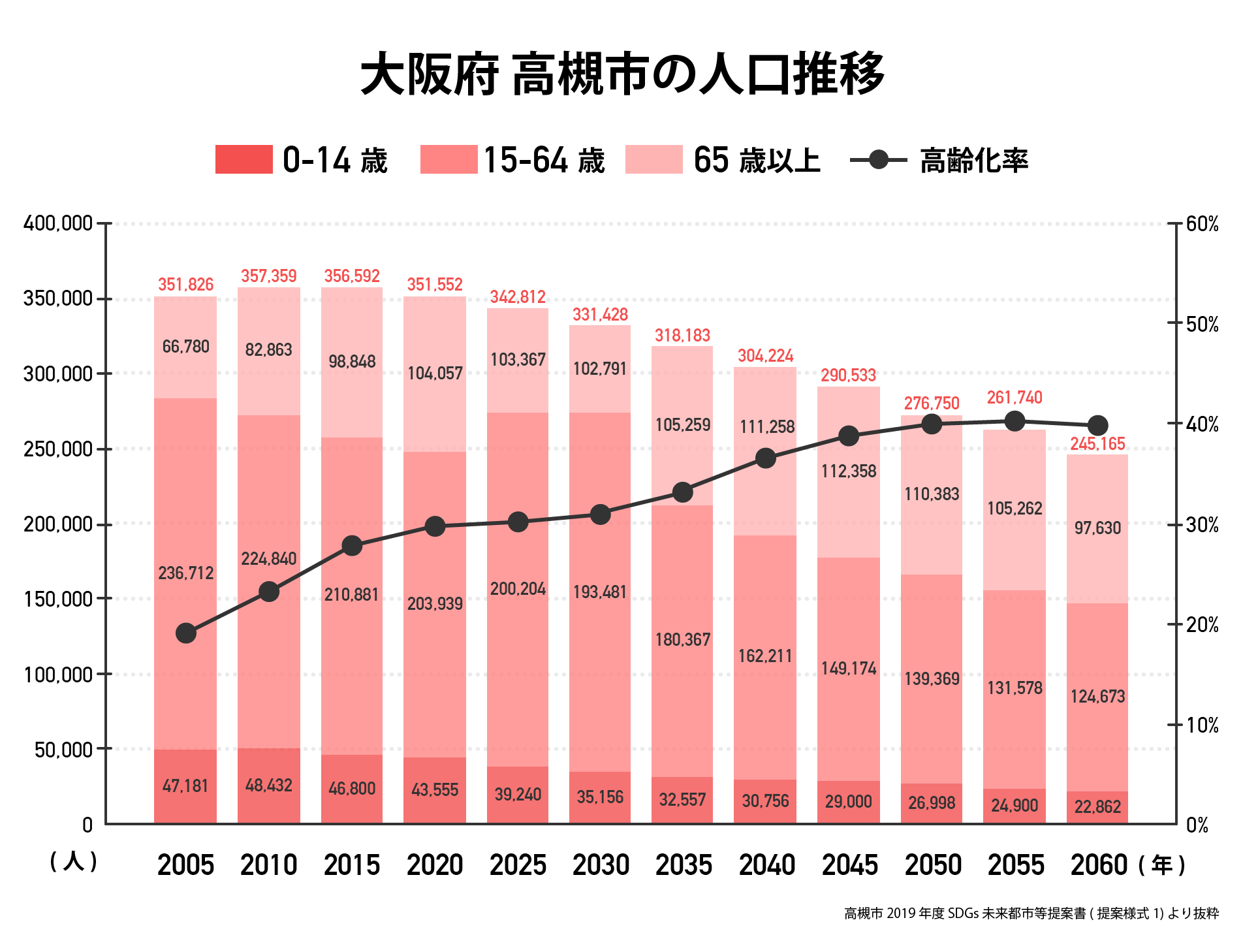全国的に人口減少が進行する中、高槻市でも国の推計と同様の推移で人口が減少すると推計されています。約 40 年後には人口はピーク時の3分の2(24.5 万人)、高齢化率は40%近くまで上昇すると推計されています!