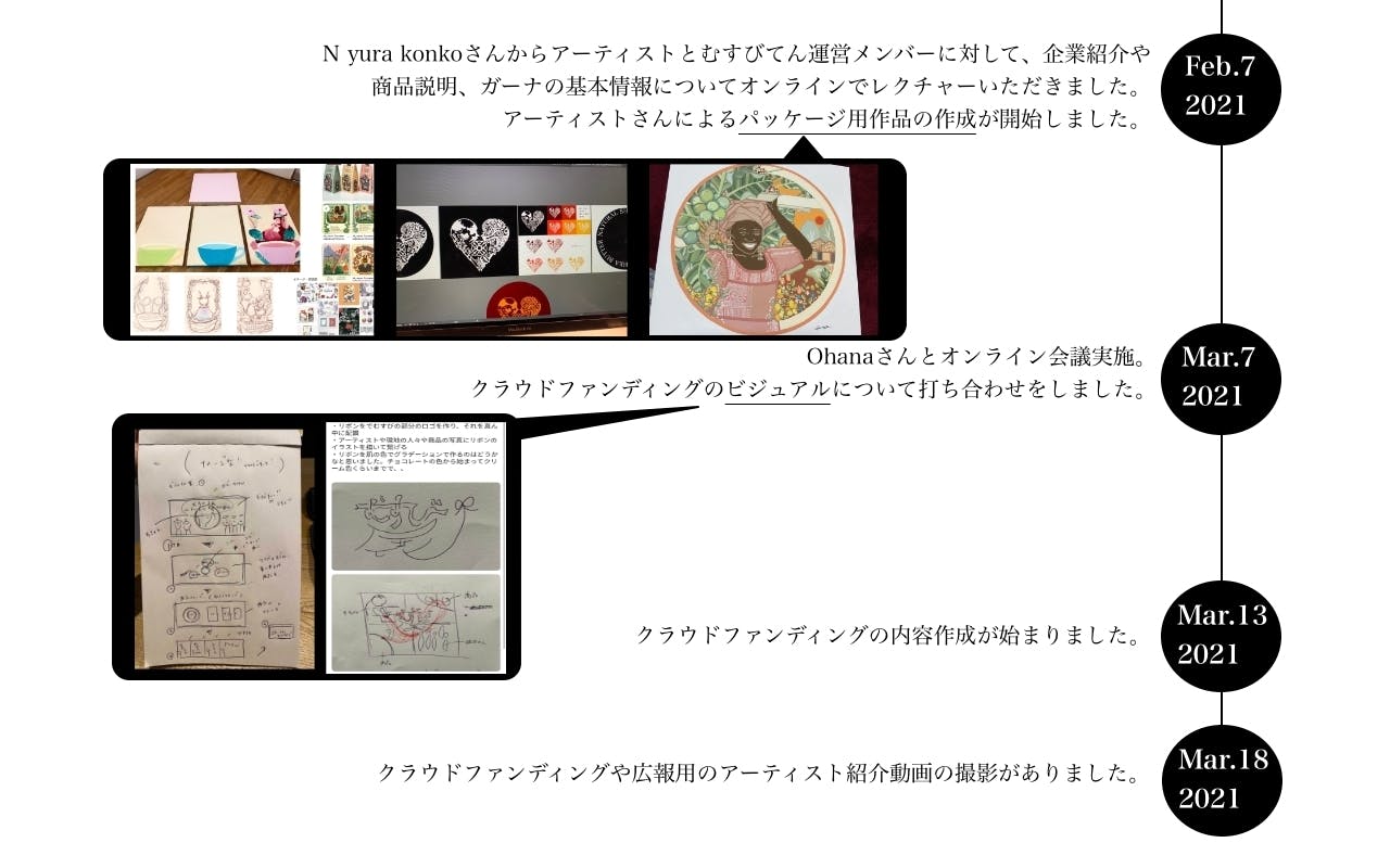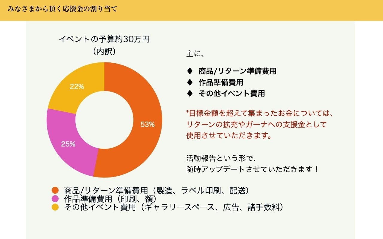 今回ご支援いただいた資金に関しましては、主にコラボ商品準備費、印刷費、作品制作準備費用に充てさせていただきます。皆様のあたたかいご支援の気持ちを形にできるよう、運営・アーティスト一丸となって企画に取り組んでまいります。
