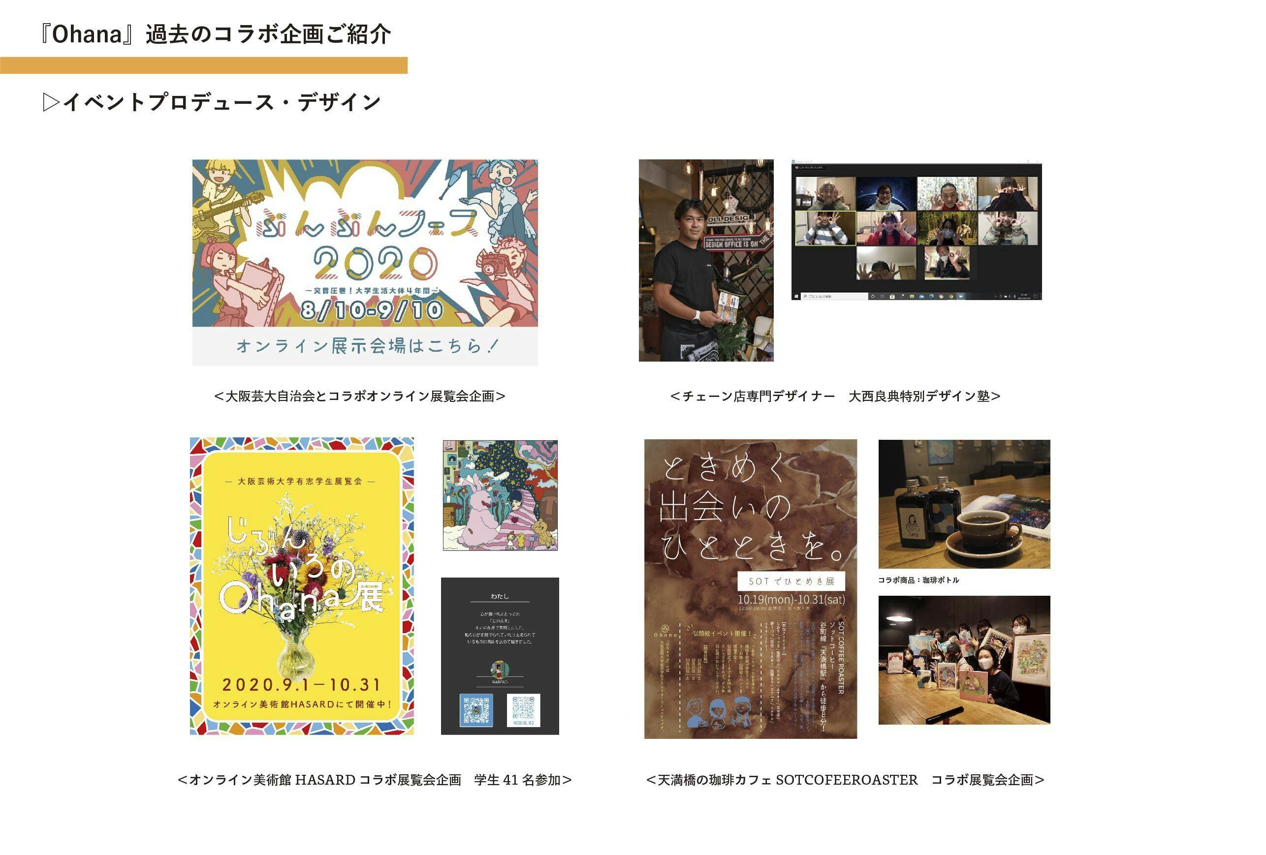 一緒に運営している学生たち(Ohana運営委員会)と、実際に社会とOhanaに登録している学生クリエイターを繋ぐコラボ企画を行っています。立ち上げてから今日まで、珈琲カフェ「SOT COFFEE ROASTER」での展覧会やオンライン美術館「HASARD」でのオンライン展覧会。そしてチェーン店専門のデザイナー「OLL DESIGN 代表の大西良典さん」のオンラインデザイン塾を開催しました。