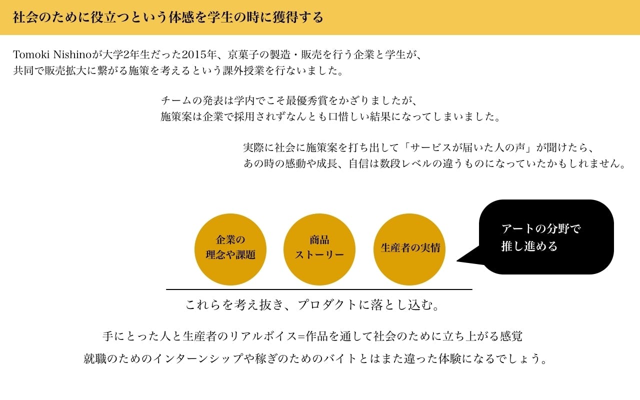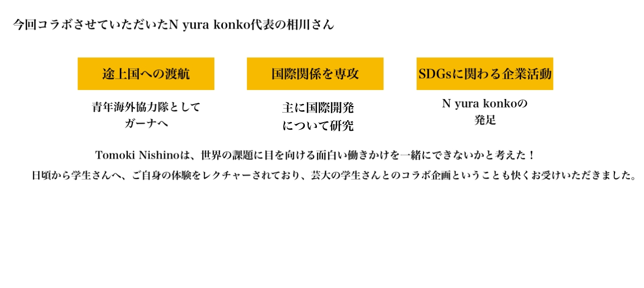 大阪芸術大学の学生団体「Ohana」の運営メンバーおよび学生アーティストガーナ直送のオーガニック化粧品/食品を扱うN yura konko(ン ユラ コンコ)を巻き込んで、三位一体でお届けする企画となっています。
