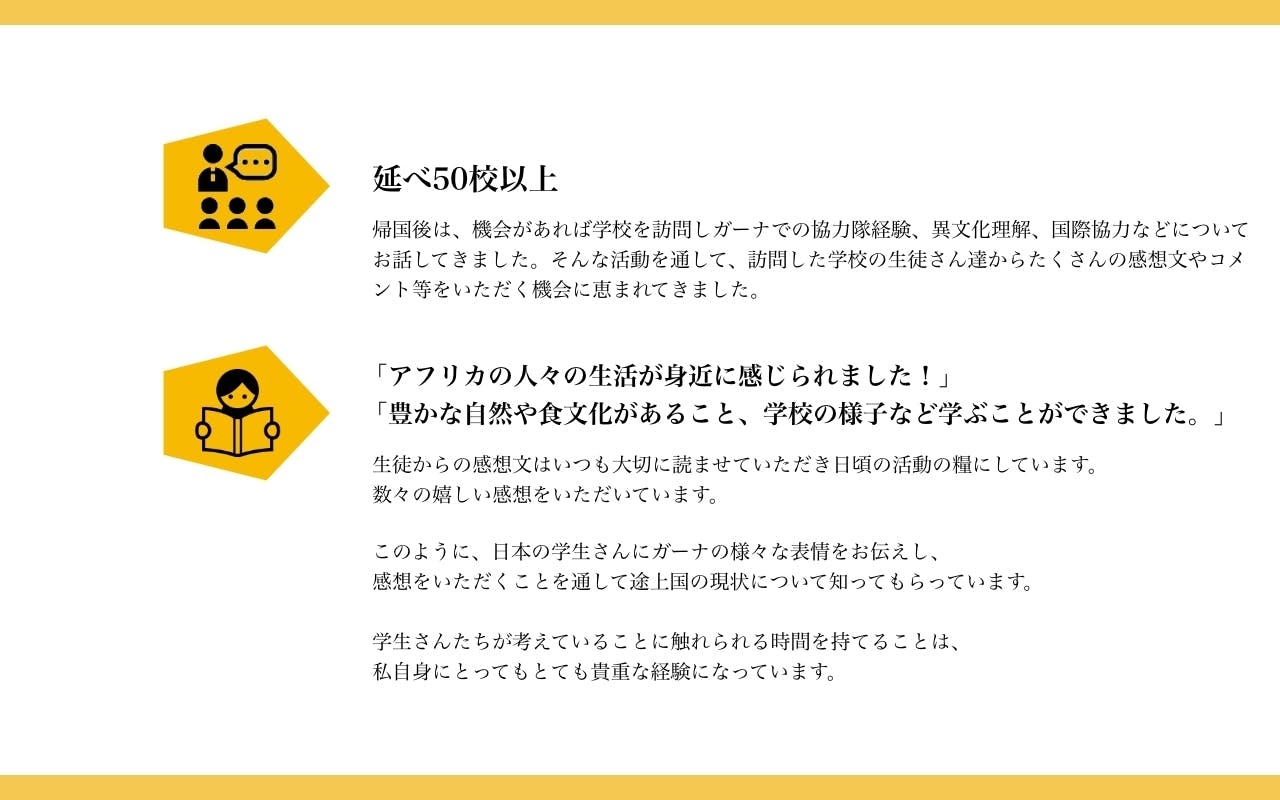 ガーナから帰国後、JICA青年海外協力隊としてその経験を自分だけに留めず、