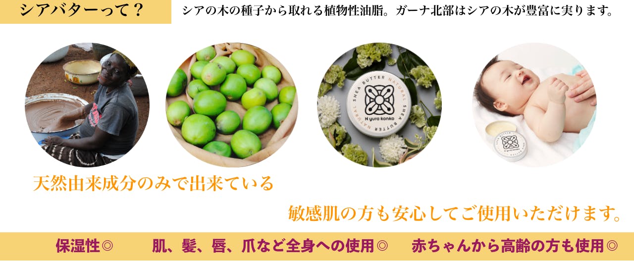 シアバターとはシアの木の種子から取れる植物性油脂のこと。ガーナ北部はシアの木が豊富に実っています。乾燥地帯で育つシアの木からなるシアバターは保湿性に優れ肌を乾燥から守ります。肌、髪、唇、爪など全身どこにでも使用可能で、生後間もない赤ちゃんから高齢の方までどなたでもご使用いただけます。天然由来成分のみで出来ているので敏感肌の方にも安心してご使用いただけます。