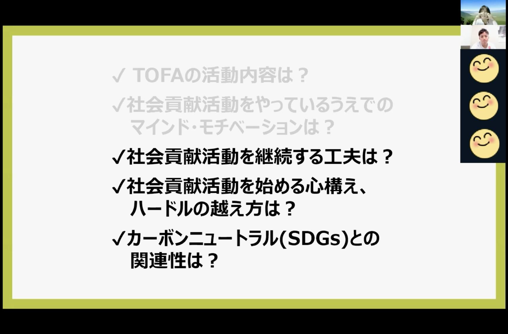 コロナ禍で皆さんも色々な制限の中で過ごされていると思います。そんな中でも多く方にTOFAのことを知ってもらいたいと思い、4月29日にTOFA代表の田中さんと一緒に私が勤める会社でオンライン講演会を開催しました。