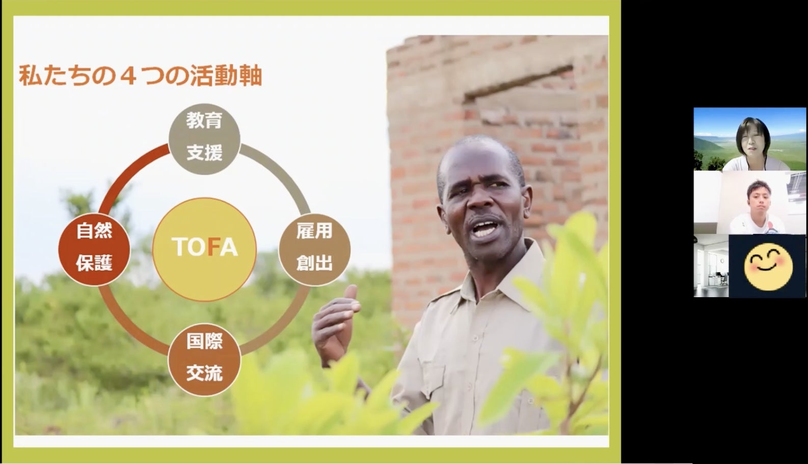 こんにちは、TOFA正会員の藤井です。コロナ禍で皆さんも色々な制限の中で過ごされていると思います。そんな中でも多く方にTOFAのことを知ってもらいたいと思い、4月29日にTOFA代表の田中さんと一緒に私が勤める会社でオンライン講演会を開催しました。講演会ではTOFAの想いや活動内容などを語りましたので、抜粋して公開させて頂きます。パート1は「TOFAの想い編」です。0:00 ~ TOFAタンザニアスタッフ ポールさんからのメッセージ *クラファントップ動画と同一3:38 ~ 今までの支援活動紹介7:52 ~ TOFAでの活動の大原則下記URLからYoutubeに飛んでもらうと概要欄から上記時間へスキップ操作できます。https://www.youtube.com/watch?v=pZYVxZRLFrU&list=PL2A3fDGlUlOkJ9Cfo1B_XcJInRTkbCyr2