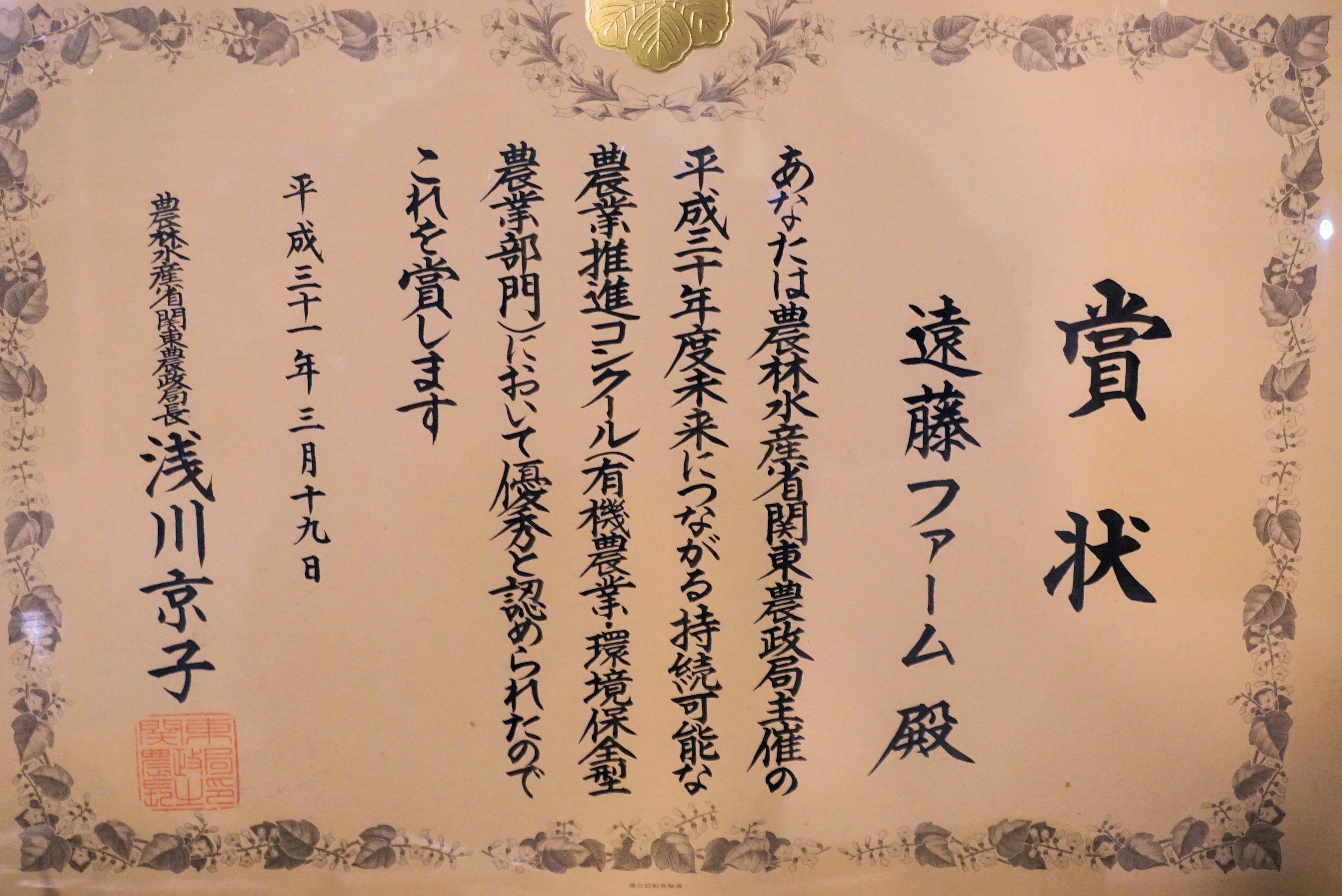 平成30年には、その取り組みが農林水産省の「未来につながる持続可能な農業推進コンクール有機農業・環境保全部門」で関東農政局長賞に選ばれました。