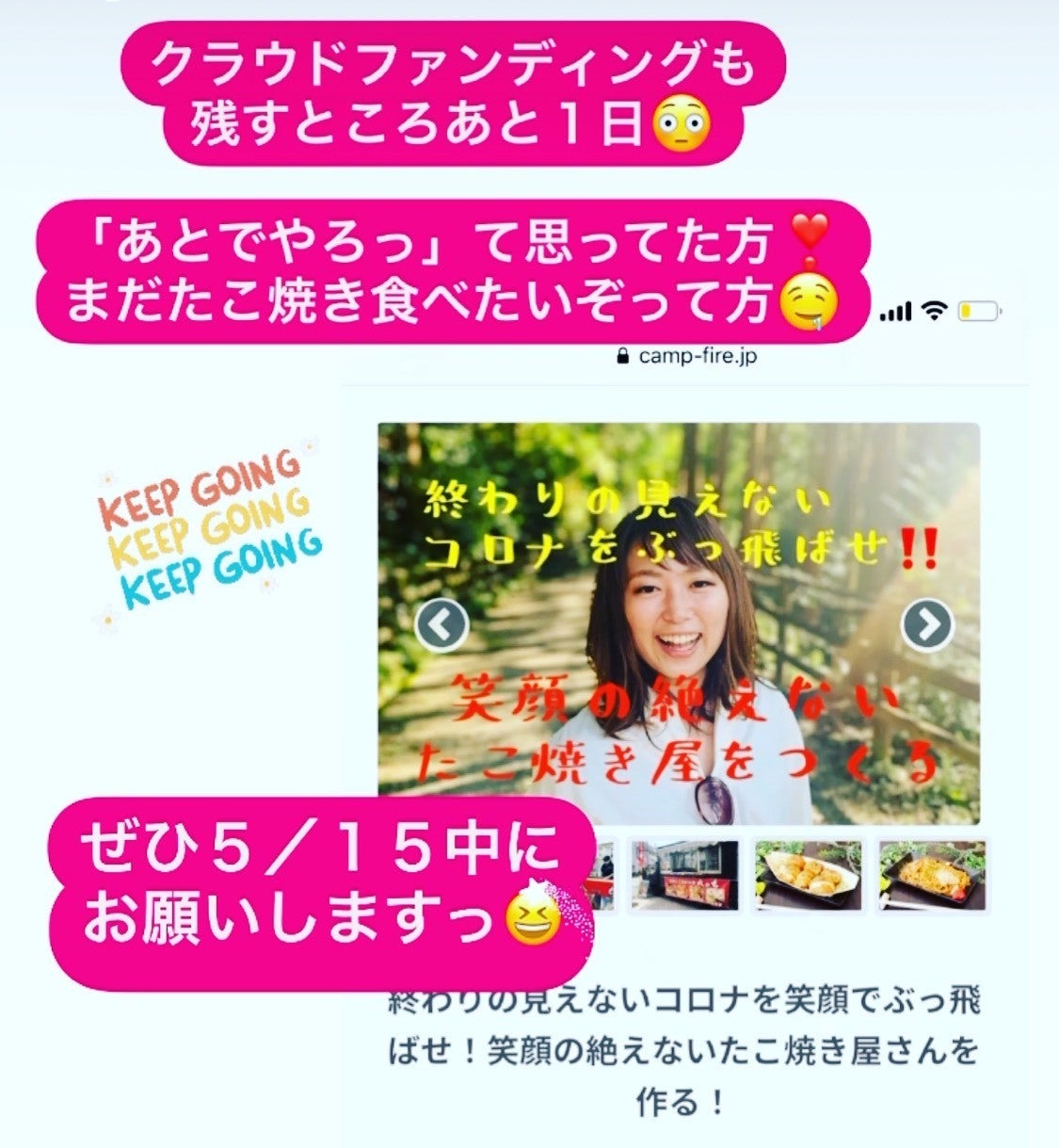 2021/05/15 07:33たくさんご支援をいただいているクラウドファンディングも、ついに今日までです!!クラウドファンディングがオープンして約1ヶ月…この1ヶ月で研修に行かせて頂いたり準備をせっせと進めてφ(・ω・ )緊急事態宣言でオープンは遅れて…と、1ヶ月で会社で働いていた頃とは違う経験をたっくさんさせていただきました(//∀//)ひとまず、まだやってないぞって方はぜひ今日お願いします(*≧艸≦)笑https://camp-fire.jp/projects/view/406370支援いただいている方には、順次リターンをお送りしていきますのでお楽しみに!♫#クラウドファンディング #今日まで #たこ焼き #大阪たこ焼き本舗 #まる #たこ焼き好きと繋がりたい #キッチンカー #キッチンカーの方と繋がりたい #独立 #開業 #FC #感謝 #人の輪 #ご縁 #笑顔 #笑顔が繋がる #大阪たこ焼き本舗まる #大阪といえば #大阪グルメ #チャレンジ #30代女子のチャレンジ #女性活躍 #コロナに負けるな #中崎町 #中崎町グルメ #梅田グルメ #持ち帰り #テイクアウト #テイクアウトグルメ もっと見る