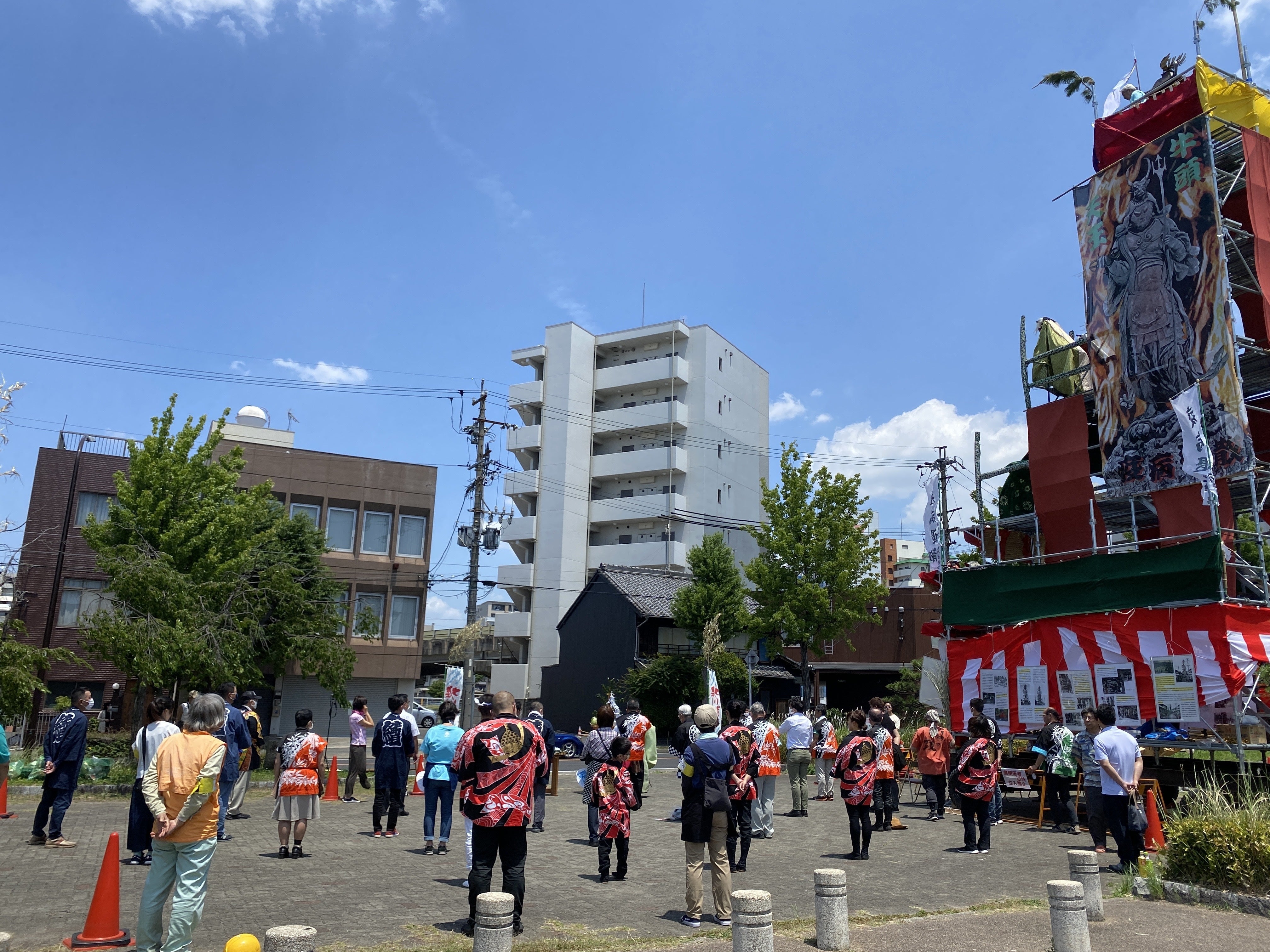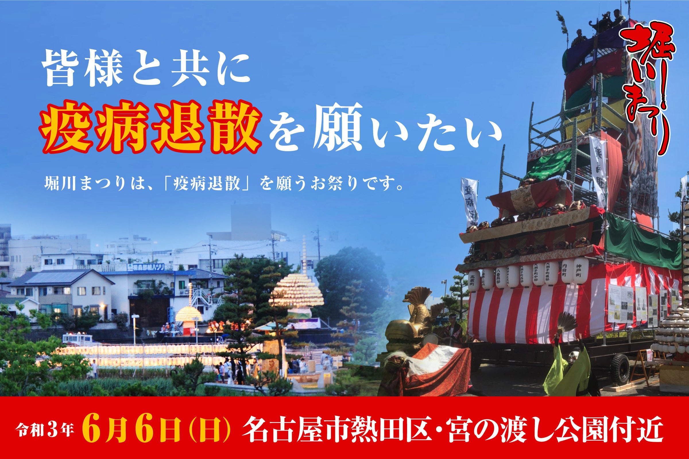 まつりが 令和元年 に 30 周年の節目を迎え、さらなる盛り上がりを心に期していた中、新型コロナウィルスが世界中で大流行しました。感染拡大防止のため、人々の生活が制限され、イベント の多くが中止または規模が縮小されました。堀川まつりも例外ではなく、昨年は、大山の曳き廻しやまきわら船は中止し、大山を設置して新型コロナウイルス 退散を願うお祓いのみを行いました。