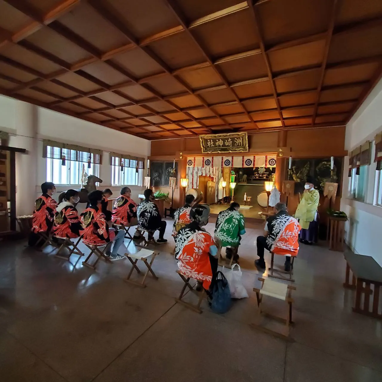 洲崎神社では、疫病を防ぐ神様「牛頭天王(ごずてんのう)」が祀られています。牛頭天王の力を借りて、まつりの成功と疫病退散を祈願しました。