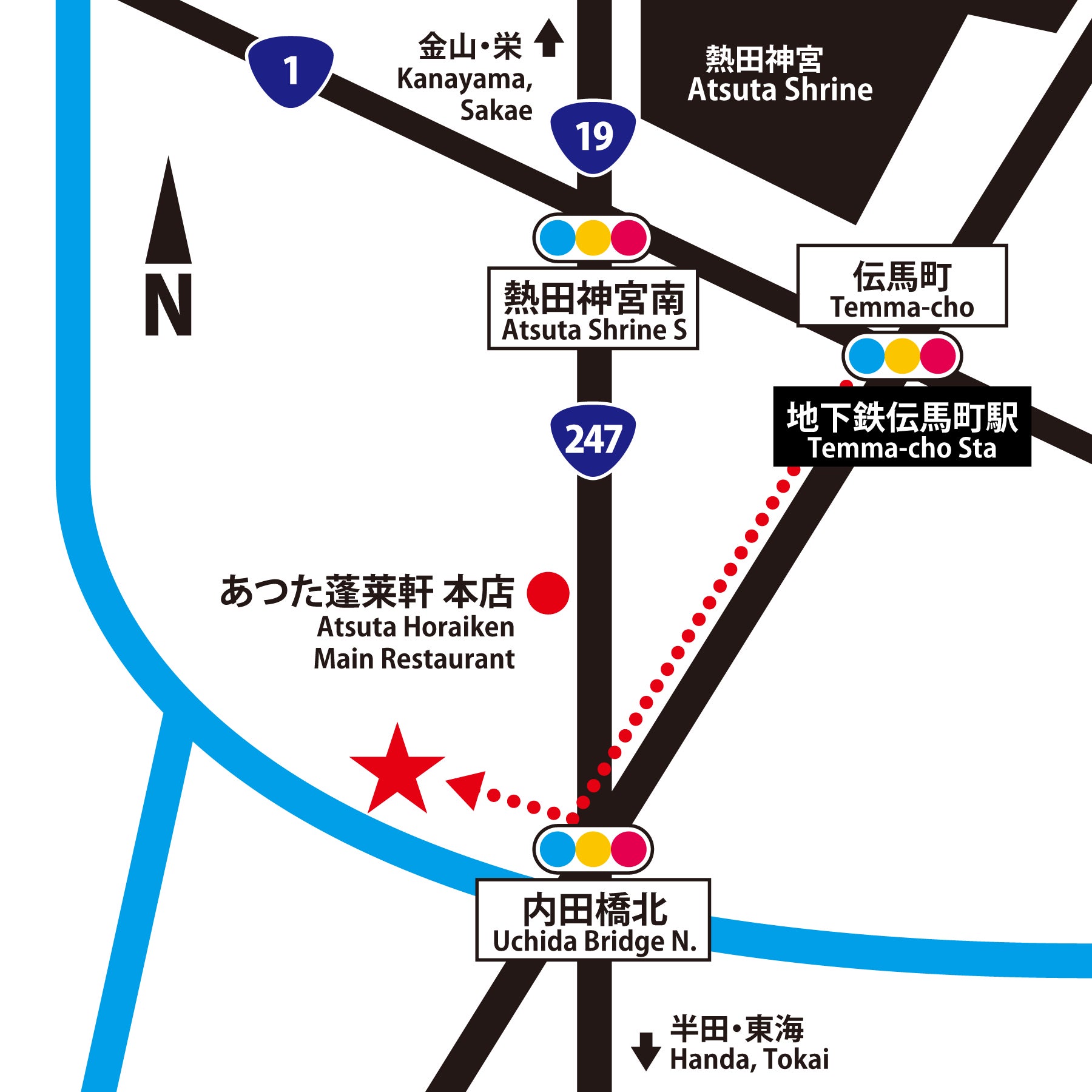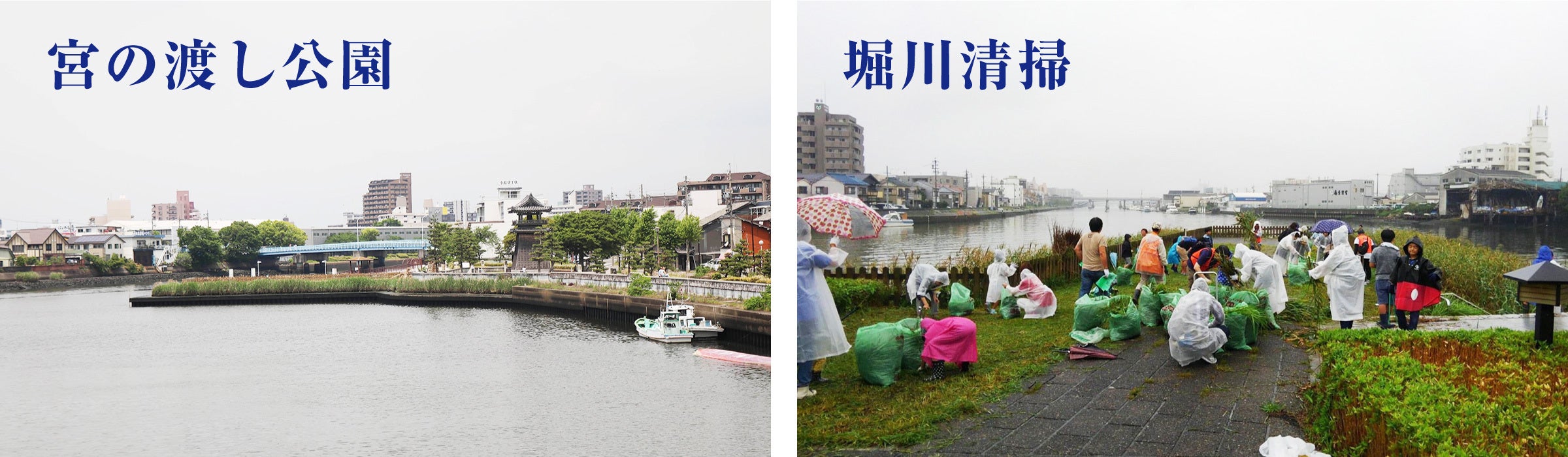 まつりは、名古屋市内を流れる堀川沿いにある「宮の渡し公園」付近で行っています。名古屋市熱田区は東海道五十三次 の宿場町「宮宿」があったところで、「桑名宿(三重県桑名市)」の海 路をつなぐ船の渡船場でした。宮宿~桑名宿の移動距離が 7 里(約 27kmだったことから「七里の渡し」と呼ばれ、宮宿側は「宮の渡し」と呼ばれていたことが公園名の由来です。