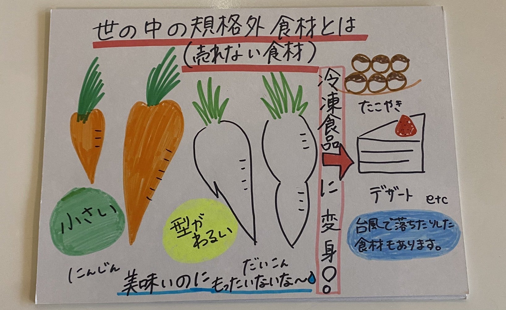 せっかく1年間かけて作った農作物が美味しさは変わらないのに、台風や雹(ひょう)などの自然災害で無駄になったり、見た目やサイズで商品にはならず、省かれる農作物があると知りました。