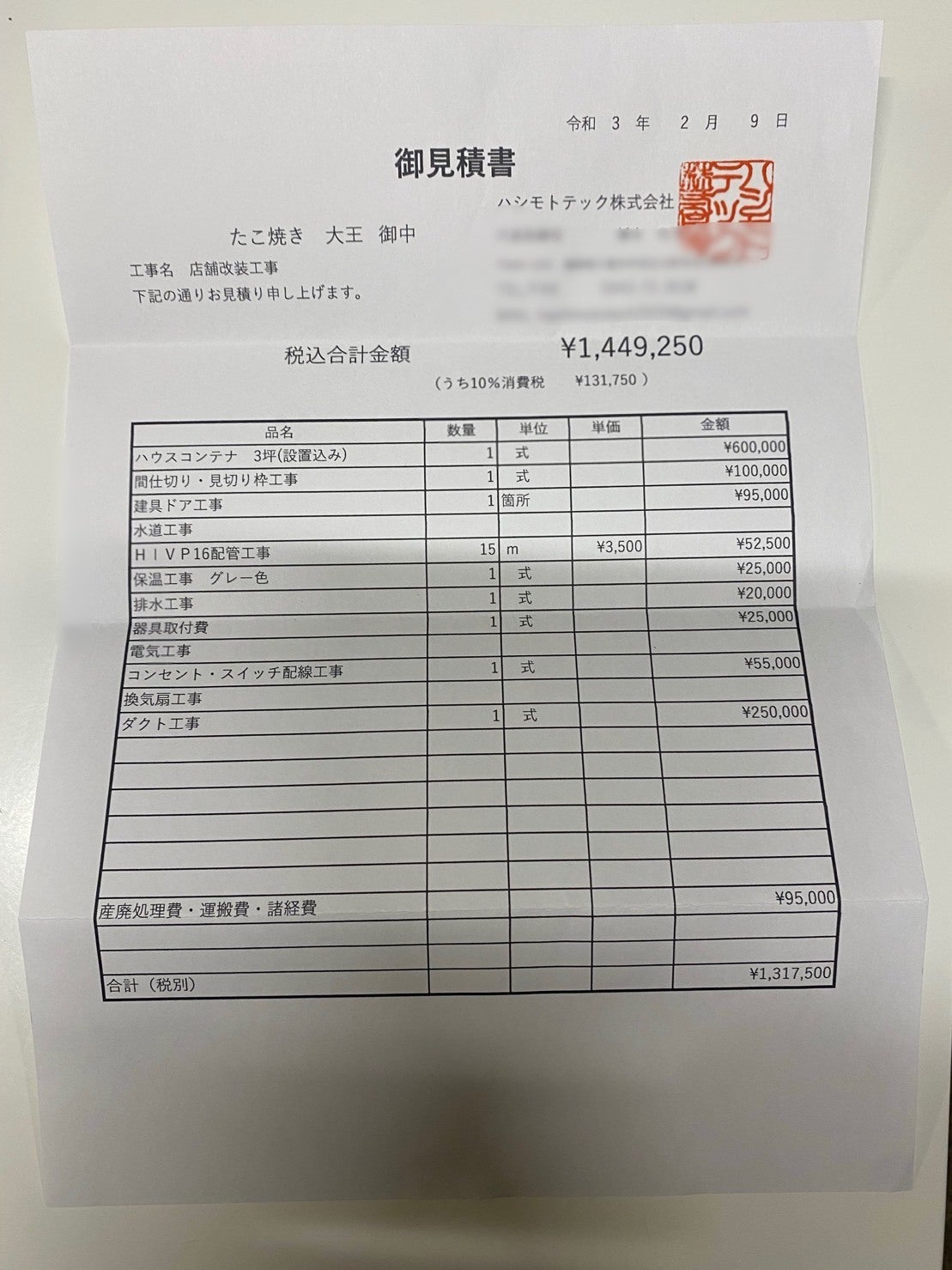 改装に関しては設備屋さんの、ハシモトテック株式会社さんにお願いする為、見積を頂いてます。
