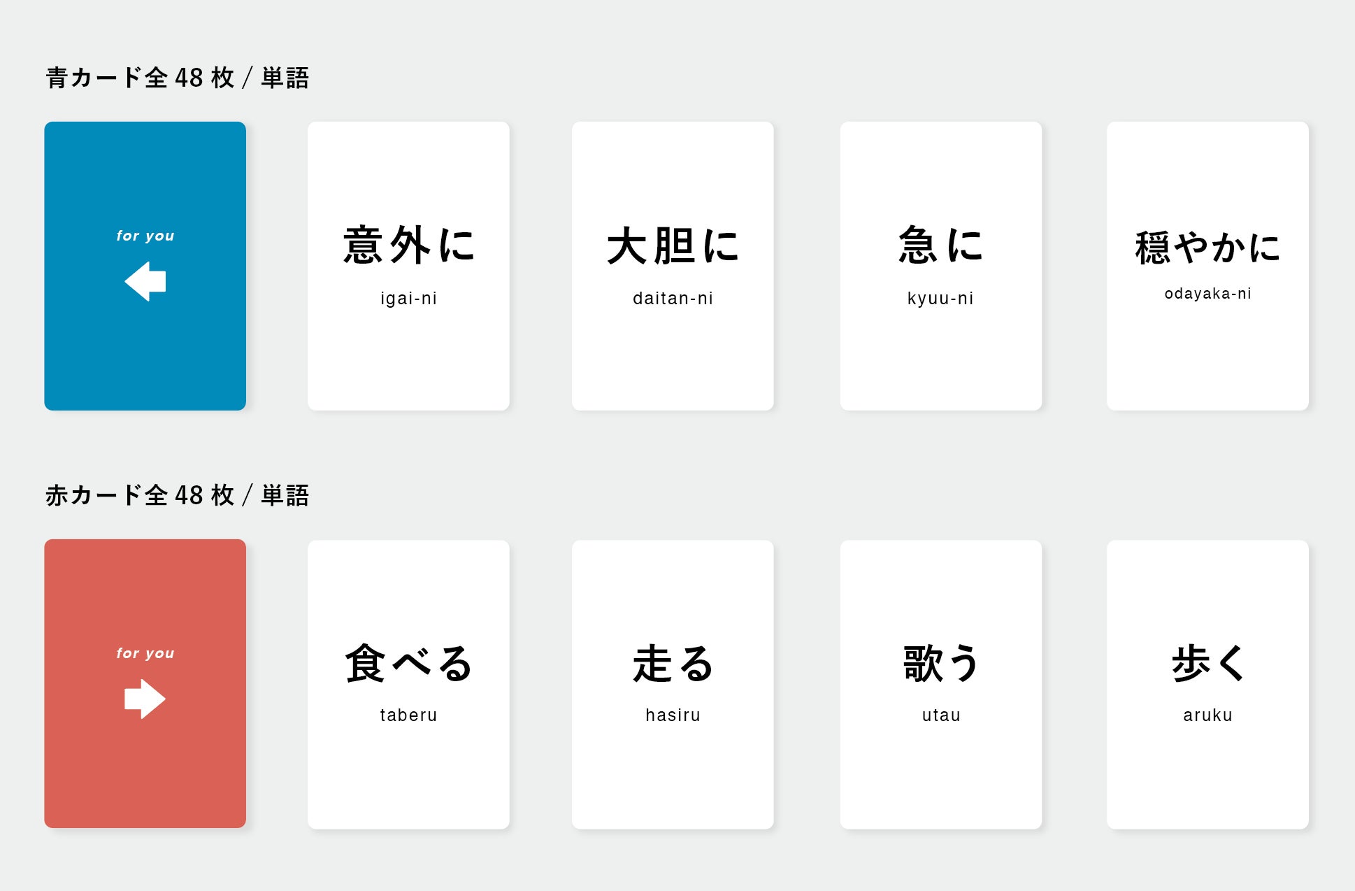 プレイヤー1人1人にこの2種類のカードが数枚ずつ配られます。その手札の中から隣の人のイメージにぴったりくる言葉を選び青カードは左隣の人、赤カードは右隣の人に渡します。