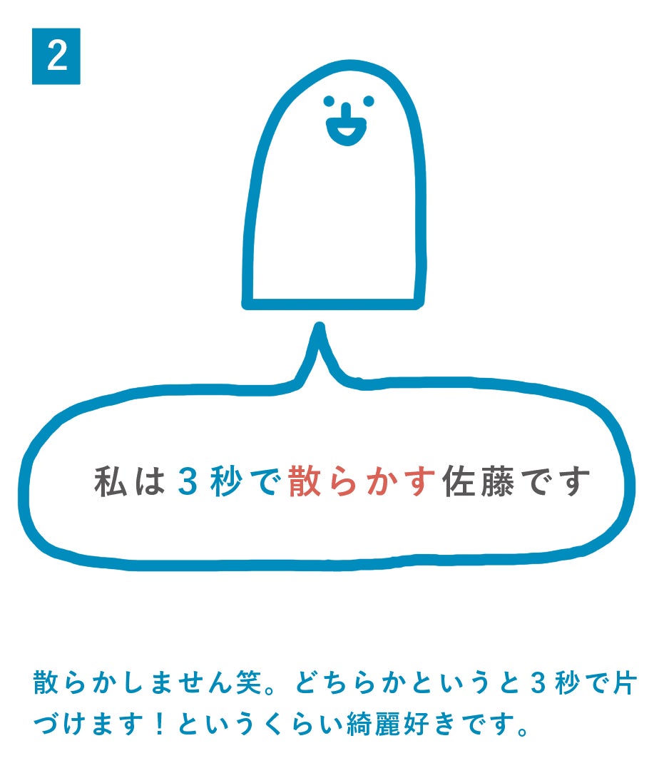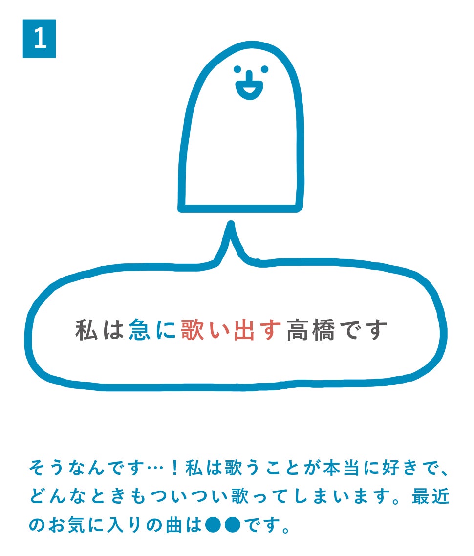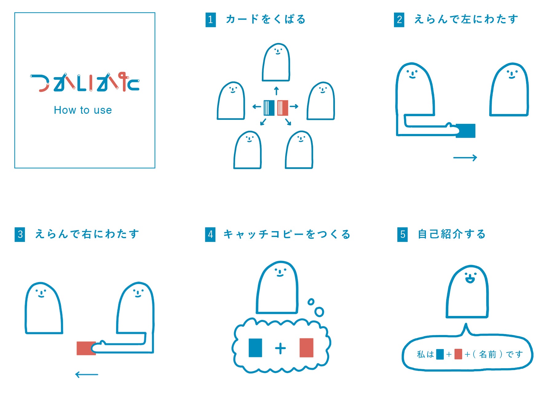 他のプレイヤーから受け取った赤カードと青カードを組み合わせて「私は、〇〇に〇〇する(名前)です!」というキャッチコピーを作り自己紹介を始めます。