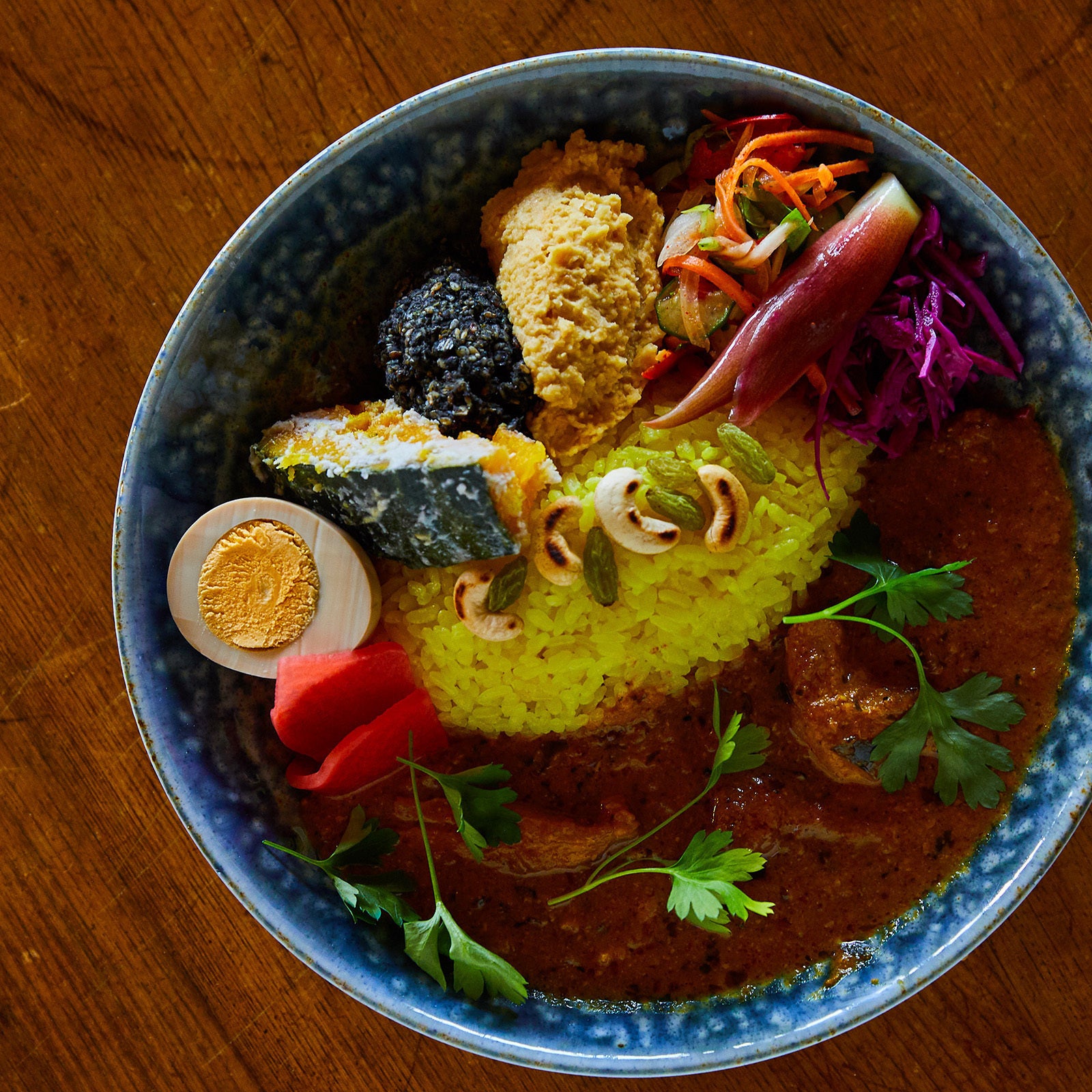 添加物や小麦粉は一切使わず、野菜とスパイスで仕上げたカレーです。京丹波町産の新鮮な野菜を使用した、季節の副菜が5~6種類ついています。