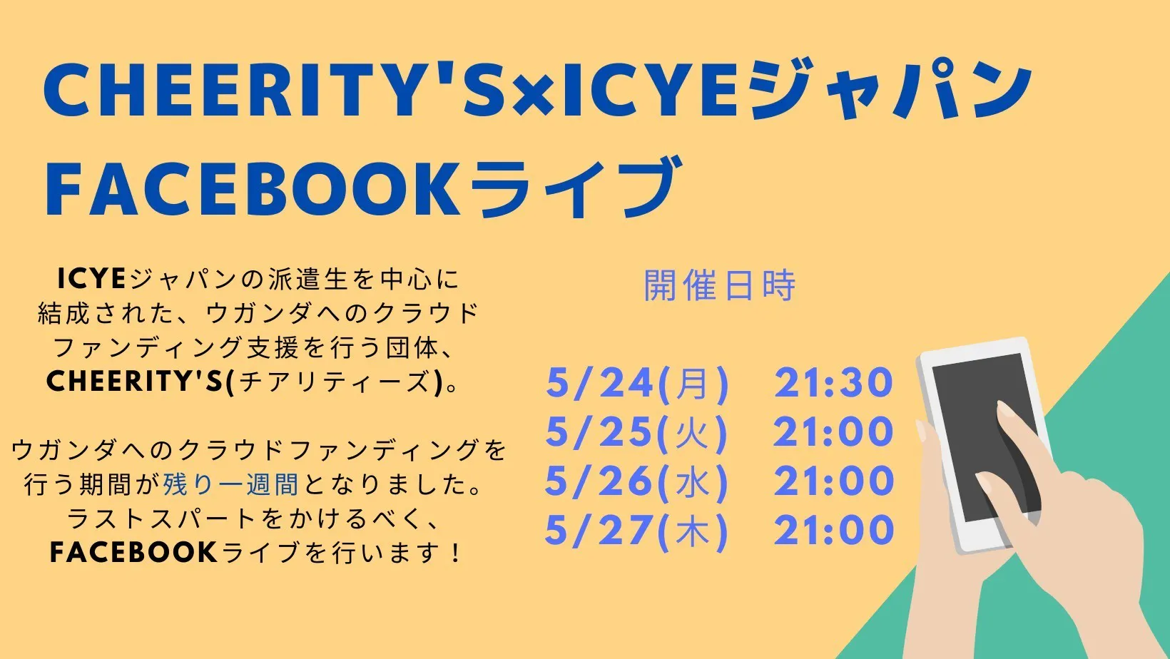 残り1週間、さらに多くの方にこの活動を知っていただき、ご協力いただける方を増やすために、月曜から毎日Facebookライブをすることにしました!