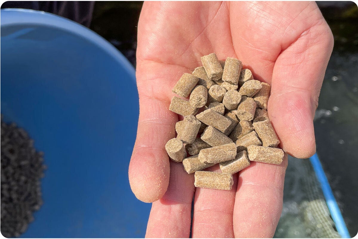 アイスルサーモンは提携の医療研究機関である株式会社ANHからの専用飼育飼料として、近年 体にもとても良いという研究結果の出ている”もずく”や”ドクダミ”を配合した飼育飼料を与えております。