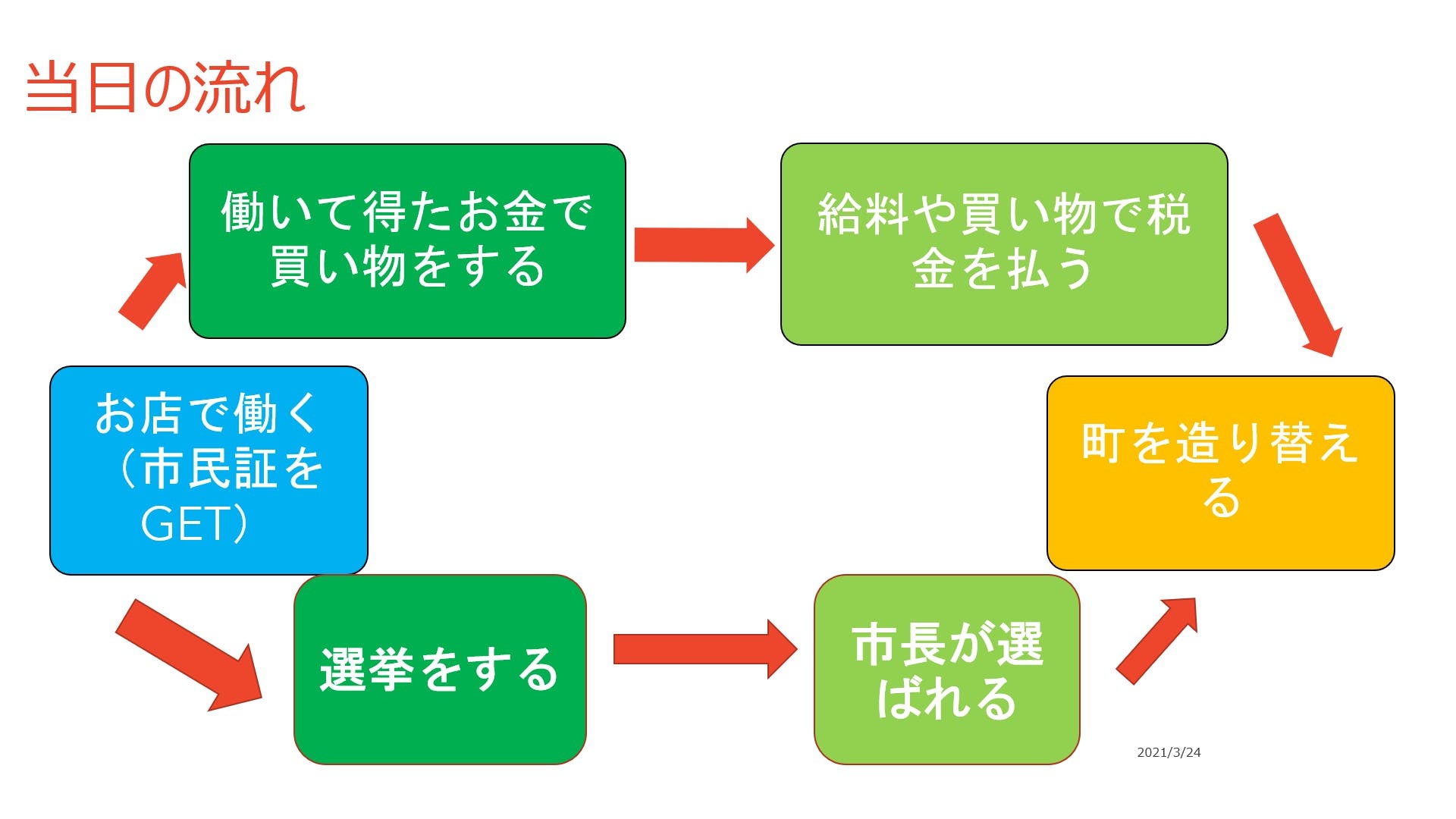 最初は、こどもスタッフのみがお店を開くことができ、当日参加のこどもはこどもスタッフのお店で働きます。お店側はハローワークで求人募集を行い、こどもたちを雇用します。給料や税金の量などはこどもたち、もしくは市長に決定権があり。当日参加のこどもたちも起業を行うことはできるが、場所代(税金)が払えなければならない。このようなお店のシステムはミニ福岡を参照に作成しました。