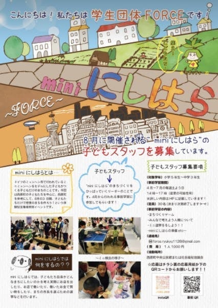 「miniにしはら」は「こどものまち」の一つです。「こどものまち」はドイツの「ミニミュンヘン」を初めとして、日本、世界各地で行われています。しかし、沖縄ではこのようなこどものまちを継続的に実施している例がありません。そのため、わたし達FORCEは第一回目のこどものまち「miniにしはら」を開催し、こどもの社会認識や擬似的な社会参画を通して、こどもたちの市民的資質を育みたいと思っています。沖