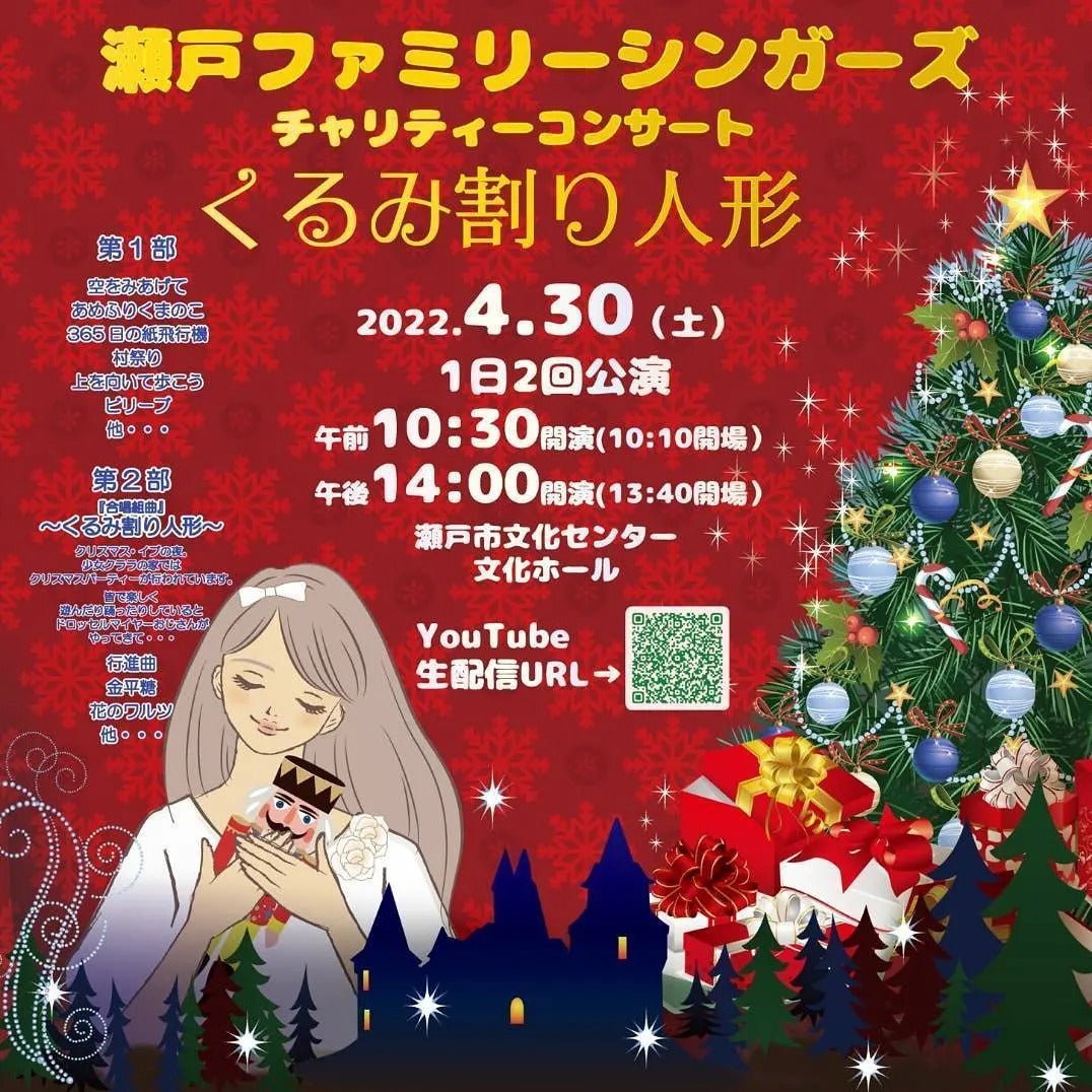 2022/04/25 13:35♪瀬戸ファミリーシンガーズチャリティーコンサート2022のお知らせ♪昨年はクラウドファインディングを通じてたくさんのあたたかいご支援ありがとうございました。コロナウイルスの影響によりこの一年も練習には困難を極めましたが、皆様のご支援のおかげで今年もチャリティーコンサートを開催する運びとなりました。毎年3月に行われるチャリティーコンサート。今年はオミクロン株の影響を受けて1ヶ月延期に。オンラインレッスンが続き大変な日々もありましたかが、対面レッスンを再開し、良いコンサートになるよう団員一丸となって練習しています。写真のQRコードはYouTubeの生配信用のURLになります。こちらからコンサート生配信を予定しています。アーカイブ配信も1ヶ月ほど予定しています。当日ご覧になれない方はぜひ後からご覧ください。詳細4月30日(土)1日2回公演10:30~ 14:00~瀬戸市文化センターにて一部 春がきた村まつり365日の紙飛行機ビリーブ 他二部 合唱組曲 くるみ割人形現在一般の入場を現在受付中です。入場無料 (要申し込み4月29日まで)観覧ご希望のお客様は一般入場者用メールアドレスsetofsz@gmail.comへ以下をご記載の上メールでお申し込みください。①お名前②ご希望の観覧時間10:30~ 14:00~どちらか③来場予定人数注意※入場するためには入場証明書が必要になります。当日突然の入場はできませんので必ずメールにてお申し込みください。※定員に達しましたらご入場をお断りする場合がございます。あらかじめご承知ください。シンガーズお客様専用LINEが出来ました。シンガーズのコンサートのお知らせや一般のお客様のご来場についての情報をこちらからも配信致します。ぜひ登録お願いします♪シンガーズお客様専用LINEQRコード↑来週はいよいよ本番。練習も大詰め!このような時だからこそ、私たちの歌を通じ、希望、元気、勇気を届けたい!平和な世の中であるよう願いたい!そのような気持ちでこのコンサートを準備してきました。メンバーみんなで心を1つにして舞台からメッセージをお届けします。メンバーみんなで一丸となりいい舞台になるよう頑張ります‼ぜひ応援してください♪ もっと見る