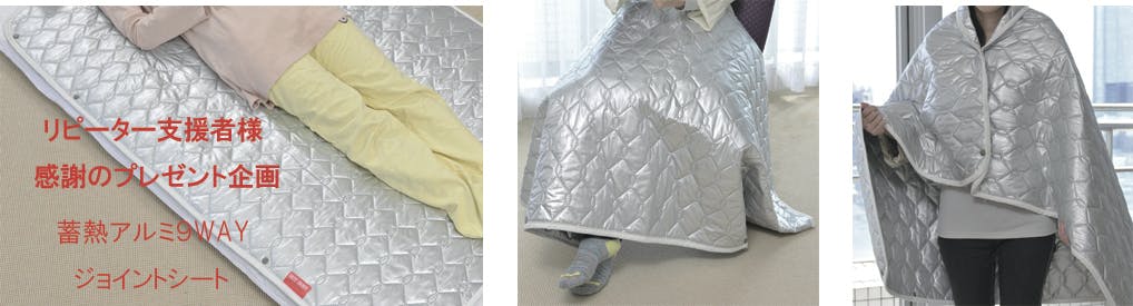 ※弊社の過去の当社プロジェクトをご支援いただいた方に、特別に何かできないか模索しています。今回初めての試みですが、感謝の気持ちを込めて、蓄熱アルミ9WAYジョイントシートを高確率抽選にてプレゼントさせて頂きます。