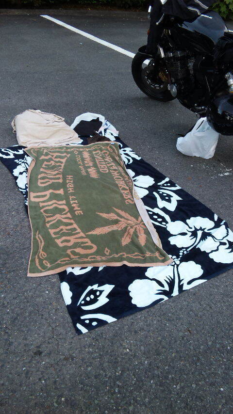 道の駅のベンチで寝ようと大きいバスタオルを使い寝始めたら。。。。なんてことでしょう。