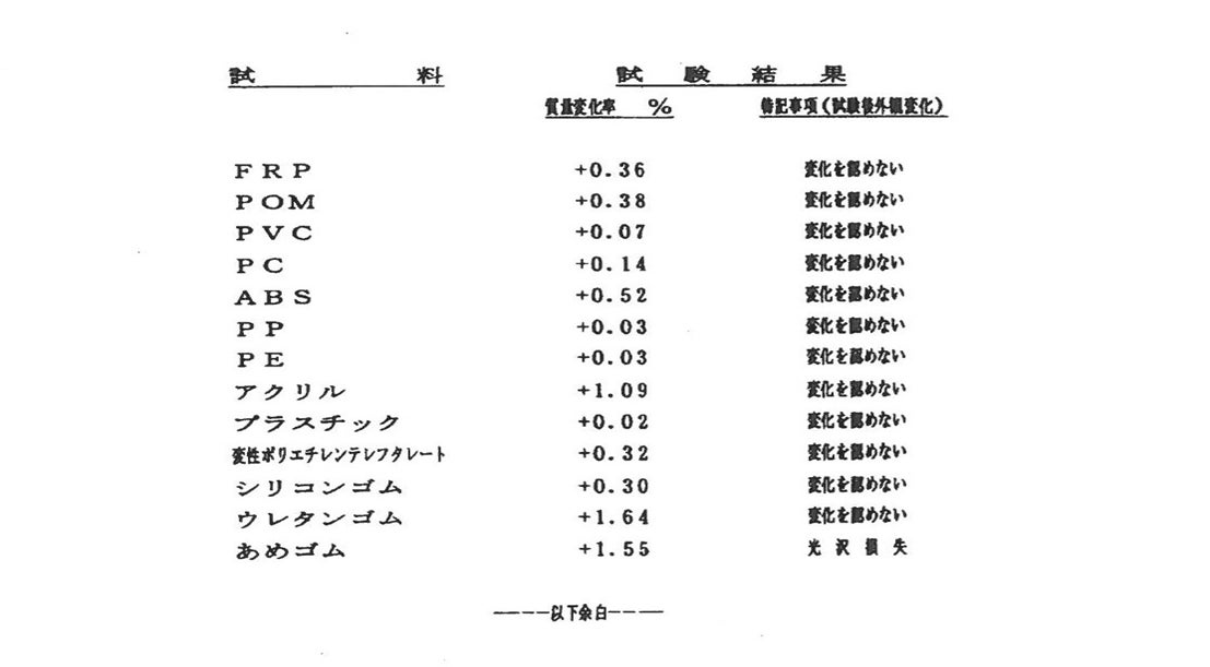 ※様々な種類のプラスチックやゴム、貴金属に付着しても痛めないことを証明しています。