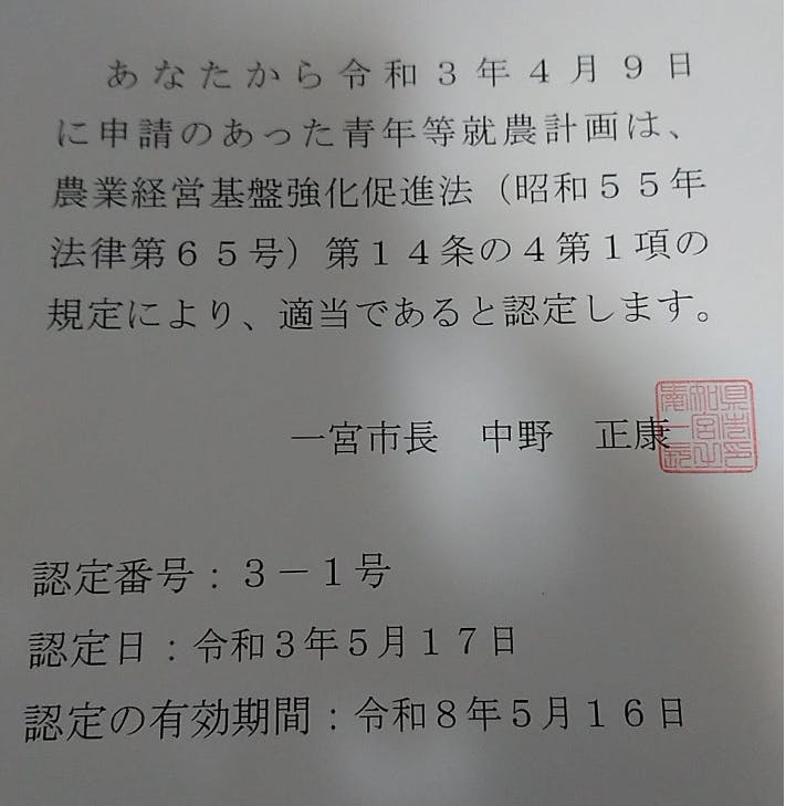 本日、就農する愛知県一宮市から「新規就農認定書」を頂きました♪
