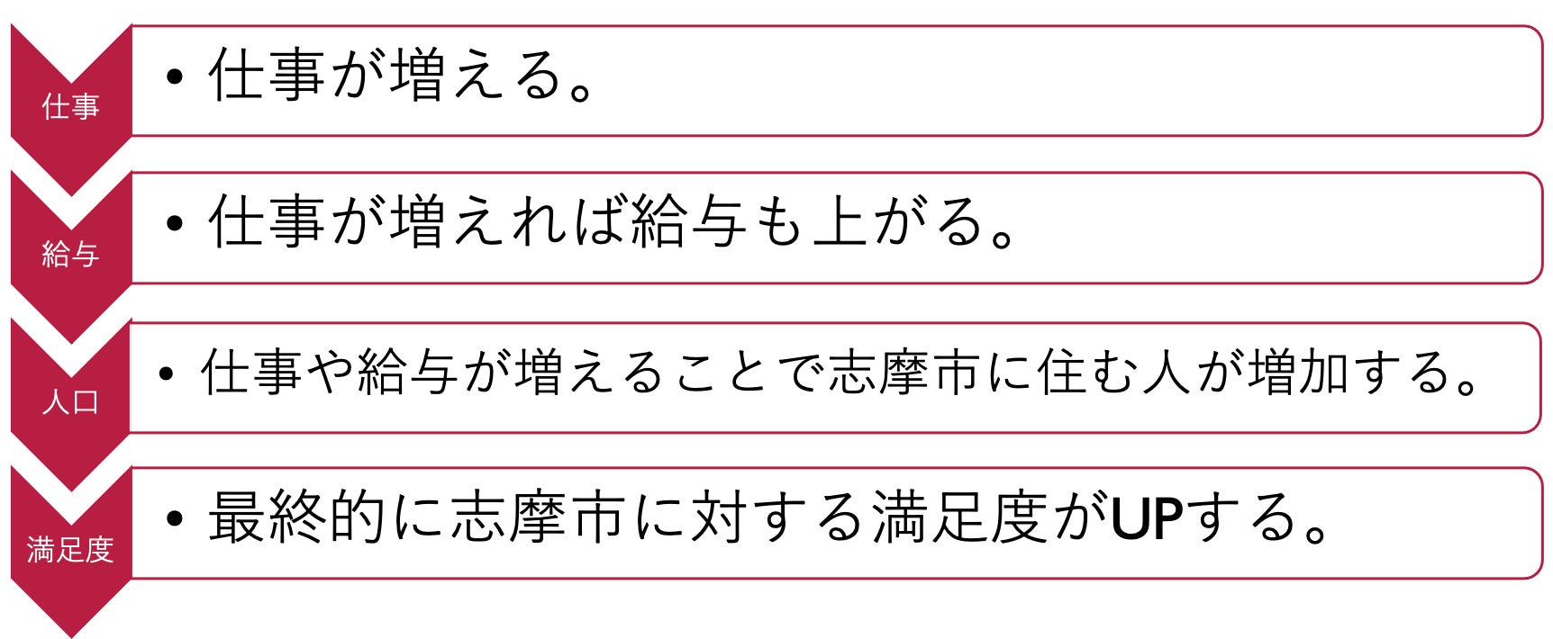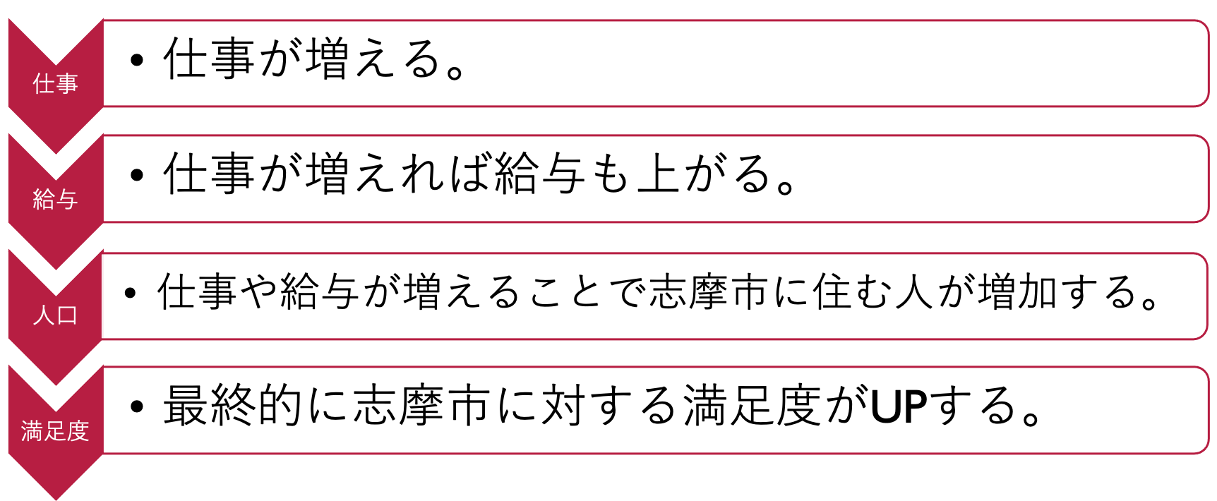 僕たちの考える『地域活性化のプロセス』では、まず仕事が増えることで地域活性化が始まります。仕事が増えることで支払われる給与額が増加します。これらの2項目が増加することで志摩市に移り住む人が増加、人口の増加に繋がります。以上の項目を達成することで志摩市の満足度が上昇し地方活性化が実現されます。