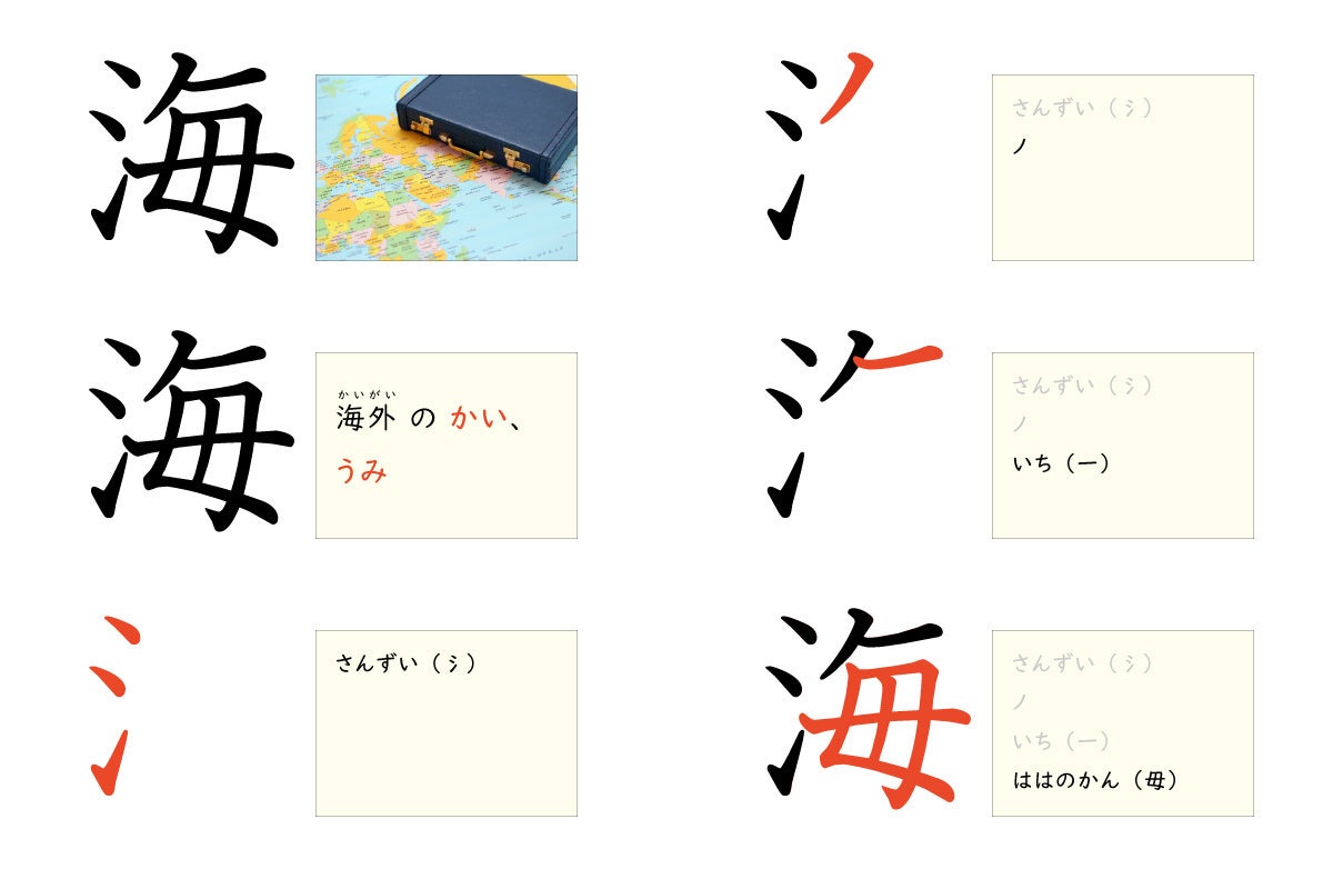 一画ずつの線の足し算で書いて覚えるスタイルとは全く異なり、「部品の組み合わせ」を唱えて覚える学習スタイルです。従来の漢字学習法に疑問を持たれている方には、きっと気に入っていただける学習法だと思います。