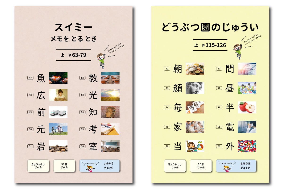 目的の漢字を探すのが大変になりがちな漢字学習教材ですが、タッチするだけで目的のページへかんたんにジャンプ可能なので、ページを探す手間が省けます。