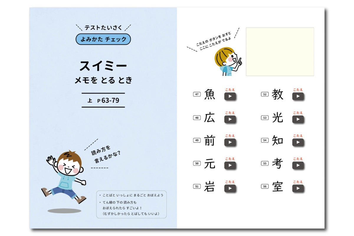 漢字eブックは教科書準拠の教材です。一般的な市販の漢字学習教材と異なり、教科書の新出順で漢字が並んでいるので、学校の授業やテストに合わせて学習を進められます。