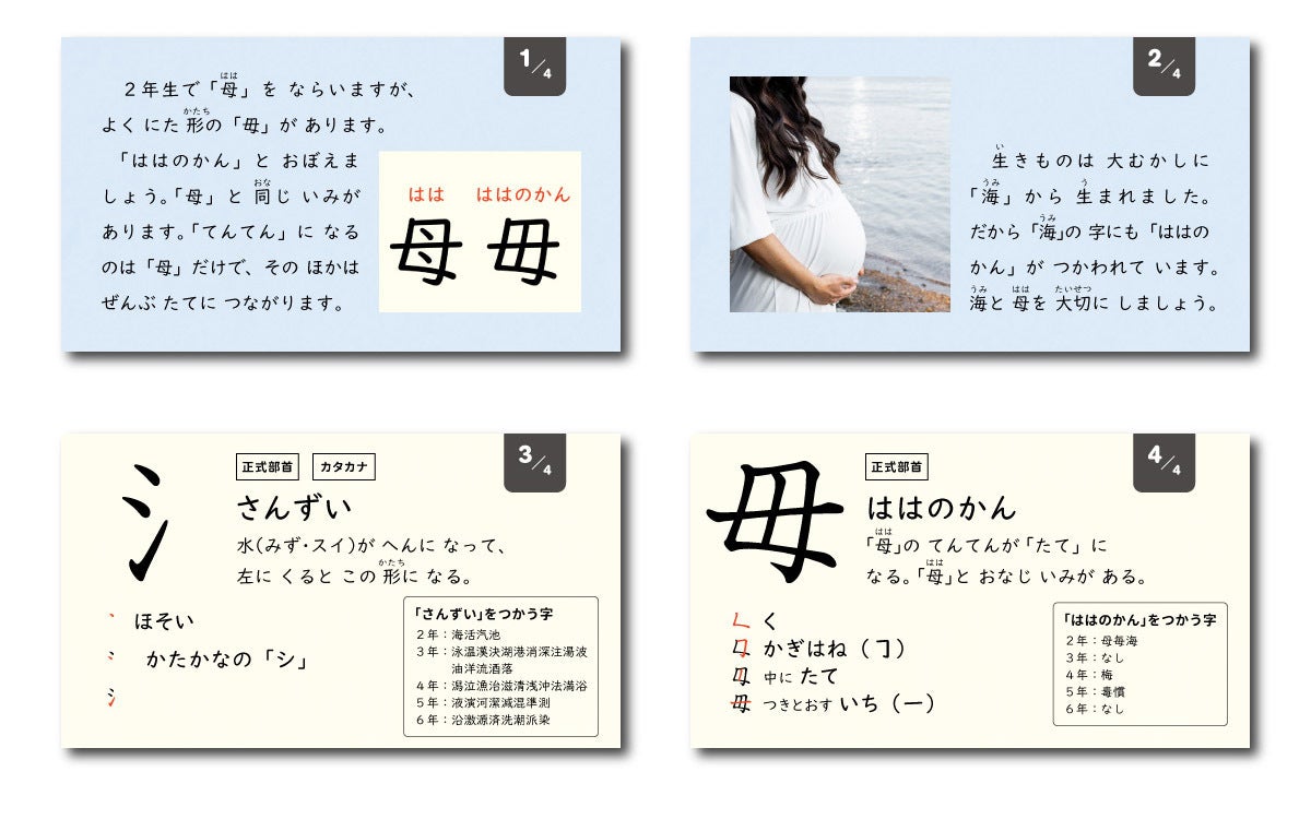 4年生以降に大人の解説はありませんが(子ども向けの解説で十分)、その代わりその学年までに習う同じ音読みの漢字、同じ部品をもつ漢字のスライドが加わります。