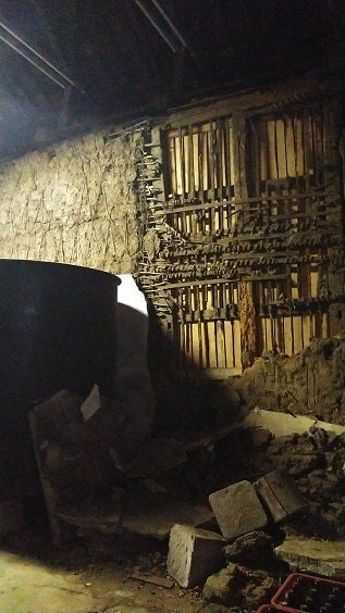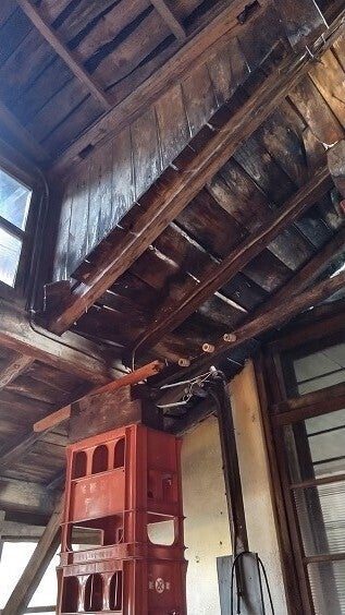 出入り口も歪み、木造の建屋を一升瓶のプラスチックケースで支えている状態です。