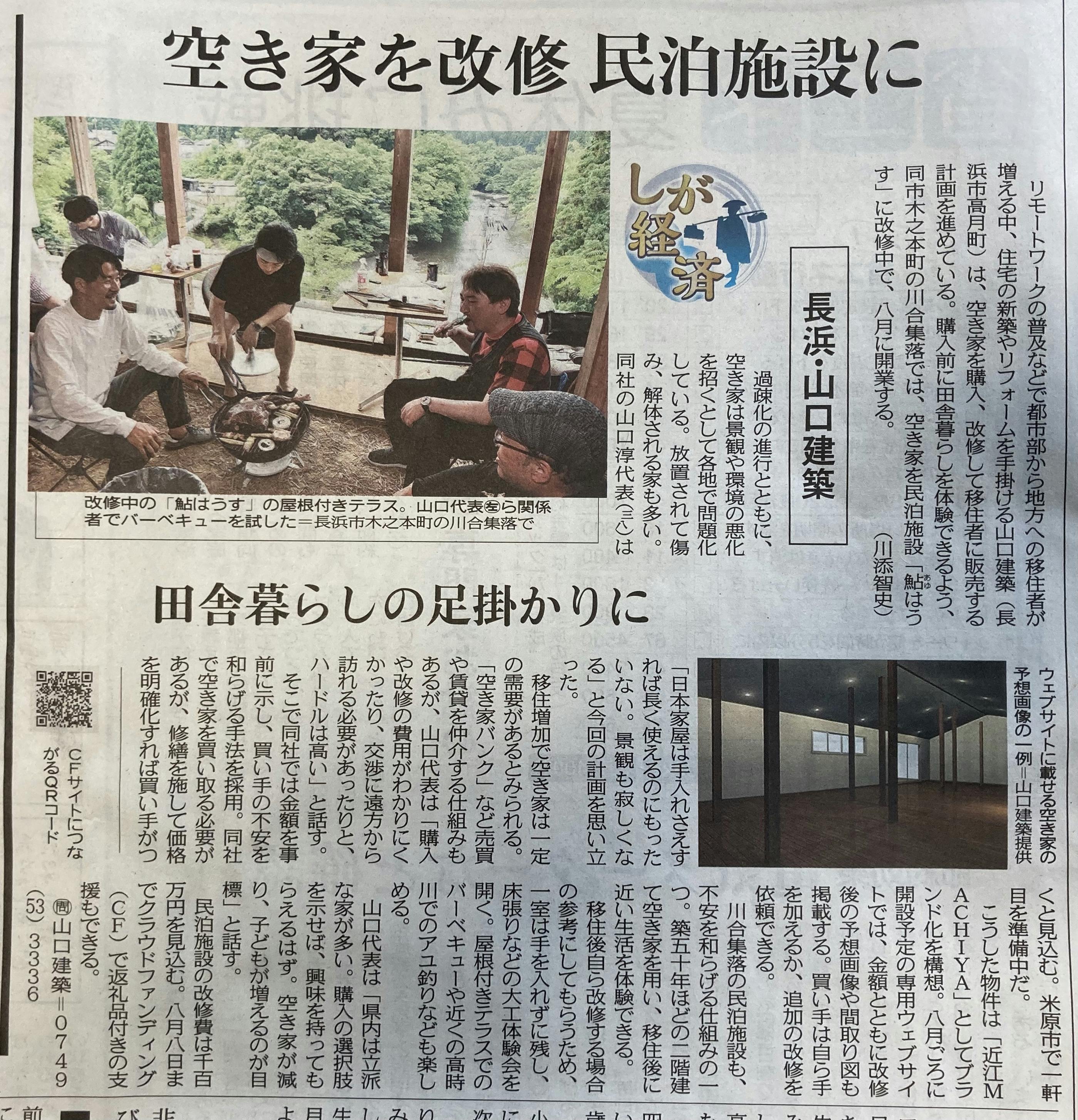 本日、中日新聞(滋賀版)に「鮎はうす」の様子や、民泊プロジェクト、今後の構想についての記事を掲載していただきました。