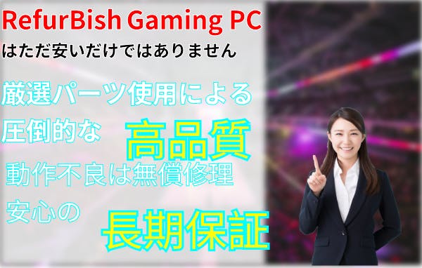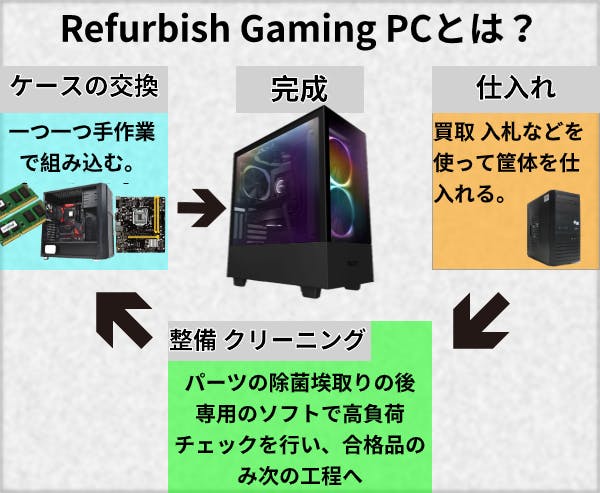 Refurbish gaming PCとは一言に申し上げれば整備済み中古ゲーミングパソコンでございます。企業で使用されているPCは節税の観点から固定資産としないためにレンタルで賄われているものが多くあります。しかしそれらは一定の期間が経過すると法務上の理由で廃棄されてしまうのです、まだまだ使えるにも関わらずです。