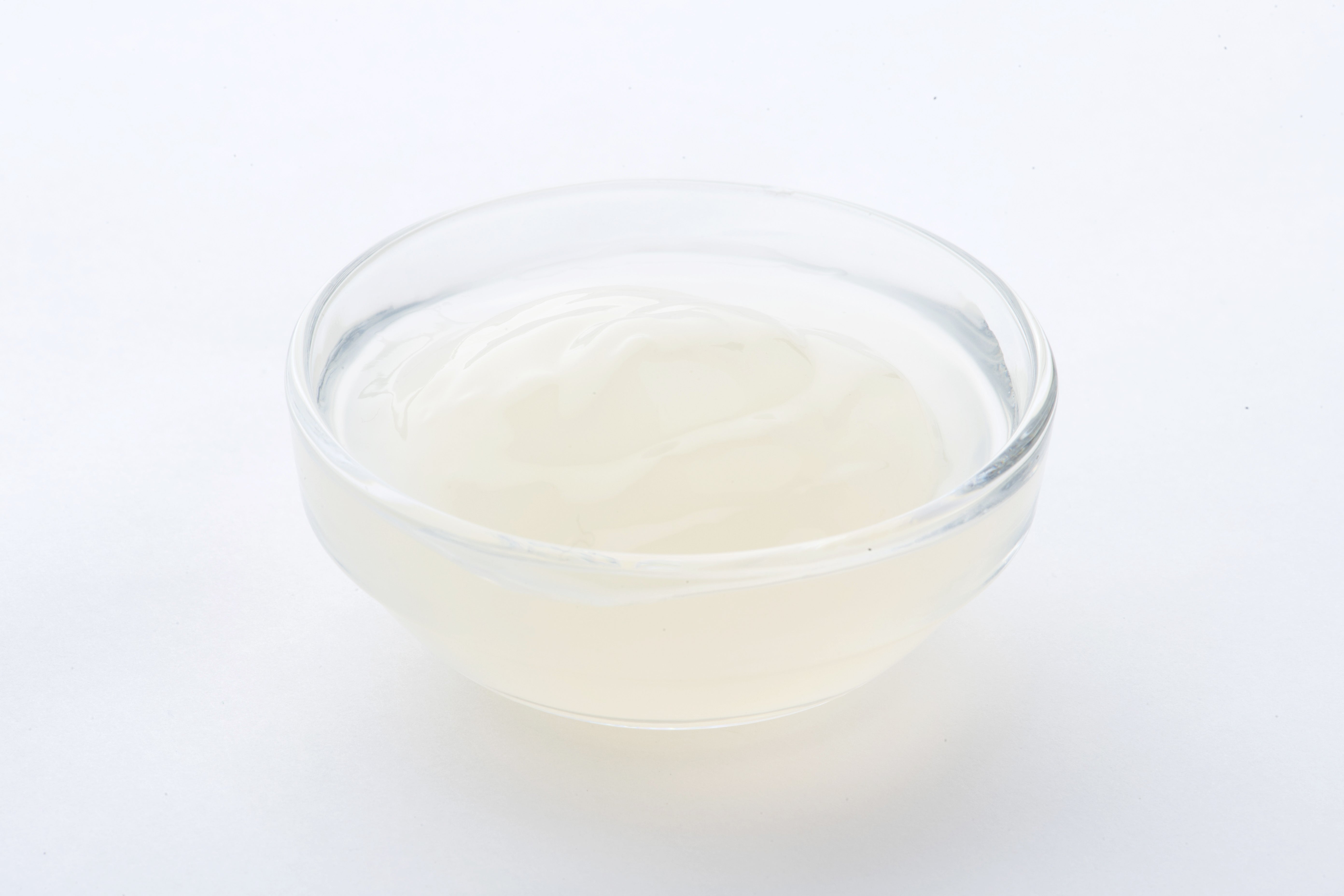 カニの殻を特殊な技術で0.00001㎜の極細繊維にしたのがキチンナノファイバー。出来上がったナノファイバーは透明感があって、プルッとしていてカニ殻から作られたとは想像できない美しさです。