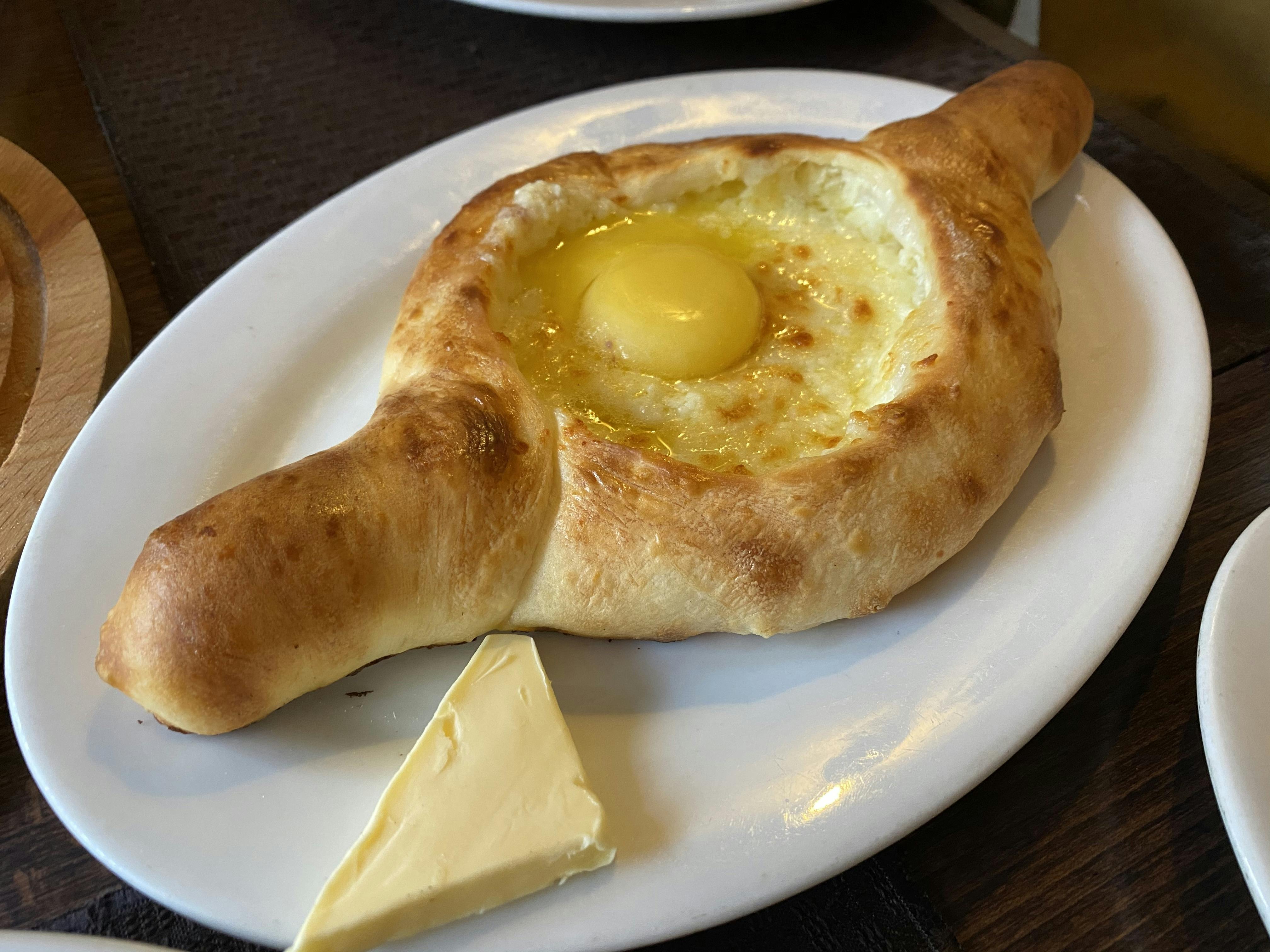 これはグルジア料理のハチャプリという料理で、ロシア人も日本人も大好きです。