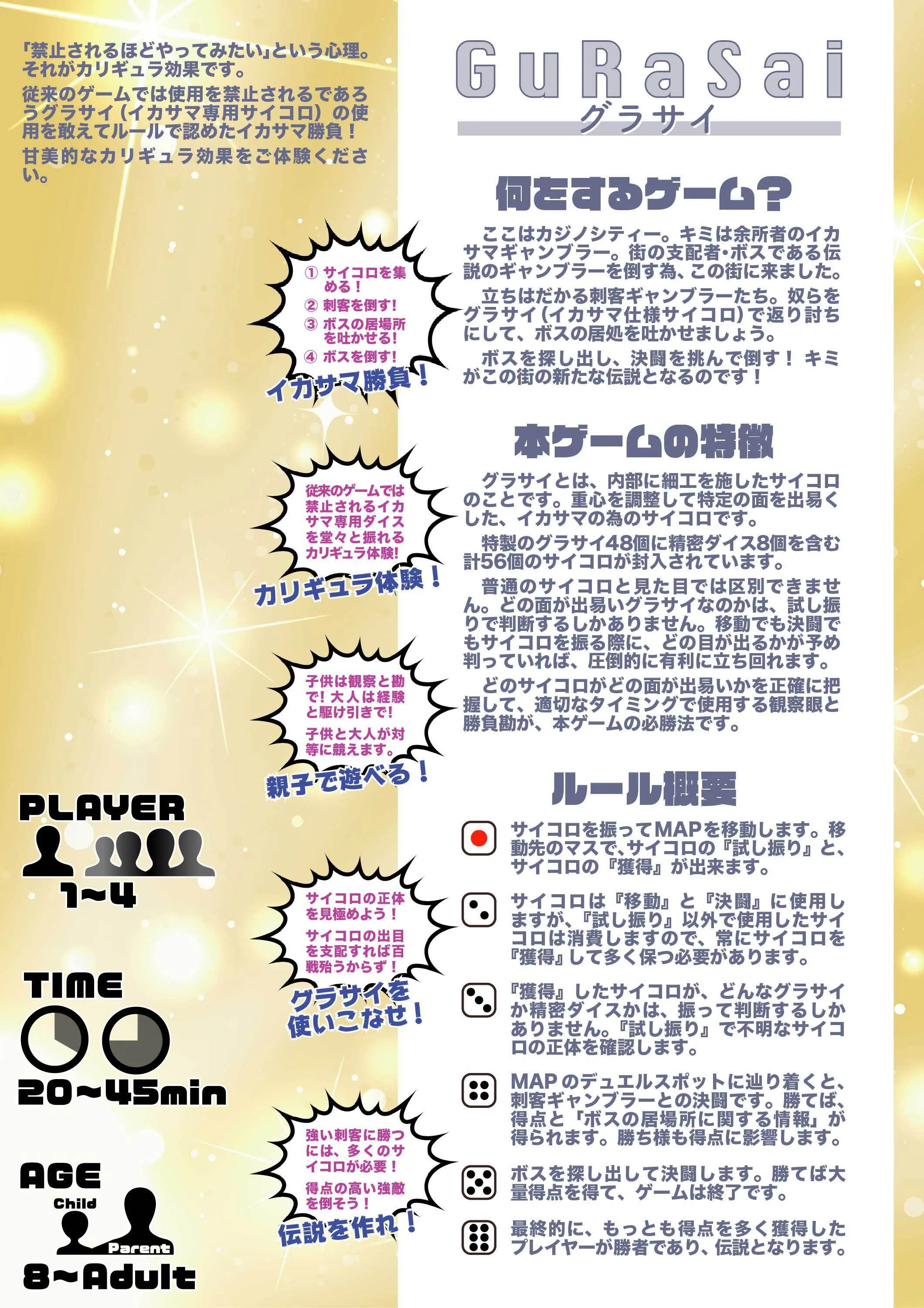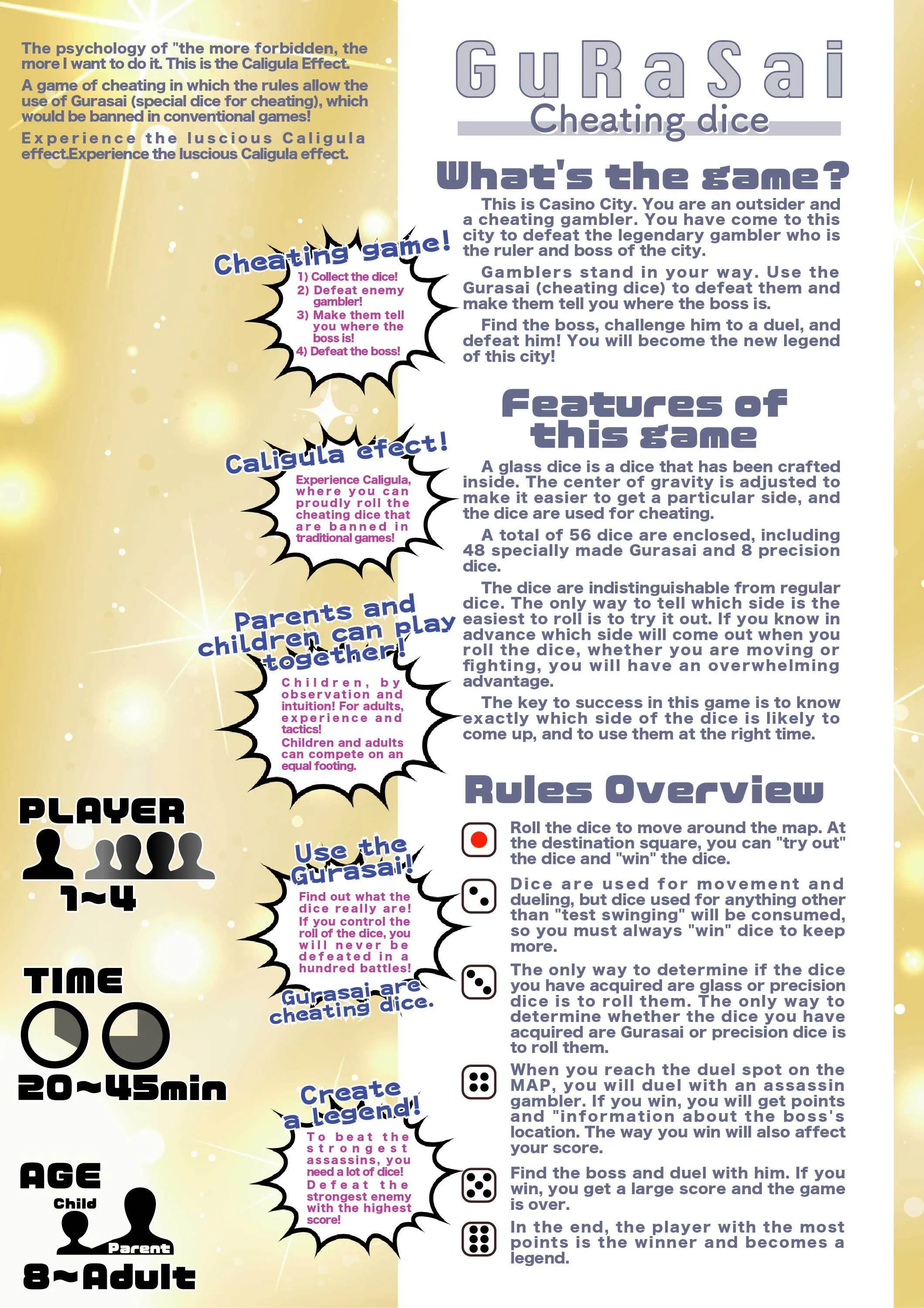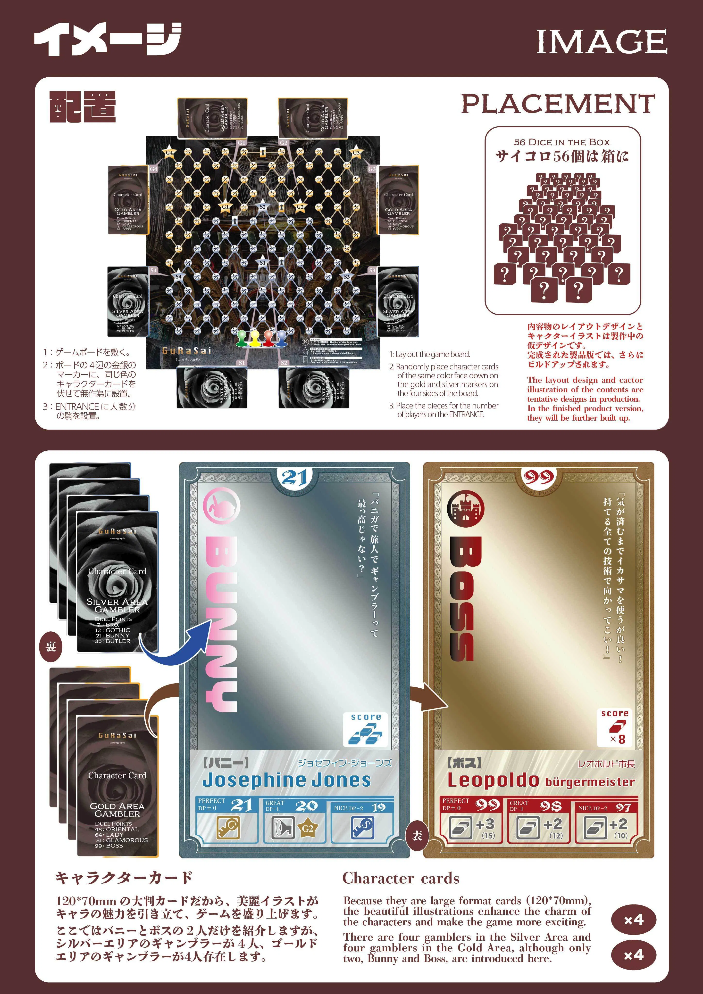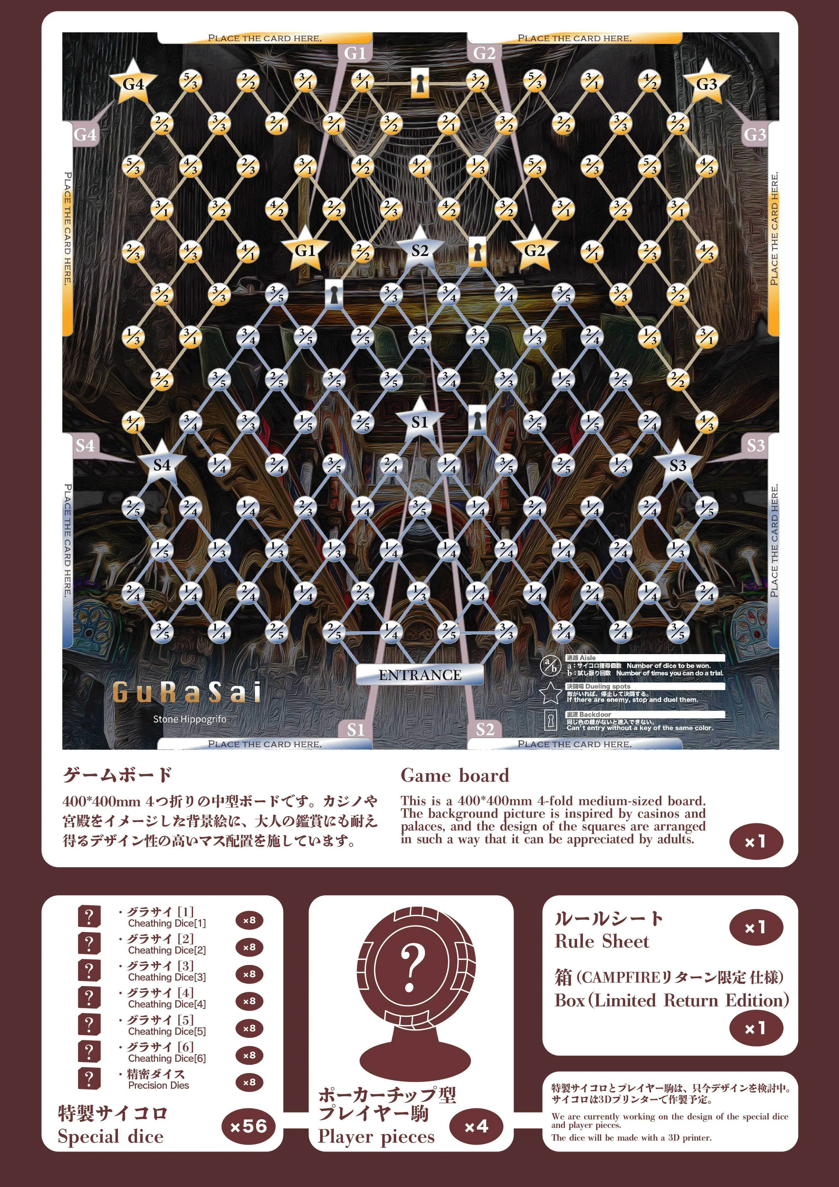 2021/05/09 07:47「何をするゲームか?」をホームで早い段階で示して欲しい、というご意見を戴きました。I've been asked to indicate early on at home, "What's the game about? We received a suggestion to show "what the game is about" early on at home.TOPイメージの4枚目と、ホームの中程には該当の画像を掲載していたのですが、確かに言われる通り、最優先に近い優先度で表示した方が概要を掴み易いですね。I had posted the 4th image on the top image and the corresponding image in the middle of the home page, but as you said, it would be easier to grasp the overview if it was displayed with priority near the top.掲載順番を差し替えようと思いますが、更新する為にはCAMPFIREの審査が必要であり、反映されるまでに時間が掛かりますので、取り急ぎ、この『活動報告』のページで該当画像をピックアップしておきます。I will replace the order in which the images are posted, but it will take time for CAMPFIRE to review them, so I will pick up the relevant images on the "Activity Report" page as soon as possible.ここはカジノシティー。キミは余所者のイカサマギャンブラー。街の支配者・ボスである伝説のギャンブラーを倒す為、この街に来ました。立ちはだかる刺客ギャンブラーたち。奴らをグラサイ(イカサマ仕様サイコロ)で返り討ちにして、ボスの居処を吐かせましょう。ボスを探し出し、決闘を挑んで倒す! キミがこの街の新たな伝説となるのです!1)サイコロを集める!2)刺客を倒す!3)ボスの居場所を吐かせる!4)ボスを倒す!◆基本情報1人〜4人(基本セット)・ソロプレイ可能なので、おひとりでも気軽に遊べます。・拡張セットなら、最大6人まで同時プレイが可能。20〜45分 が、プレイ時間の大体の目安です。・ソロプレイなら15分以内。・複数人でのプレイ時間は、早くて「プレイヤー人数×5分 +5分」、長くても「プレイヤー人数×10分 +10分」ぐらいとなります。ゲームに慣れていない場合は、さらに+15分ぐらいかかるかもしれません。・最短ルート(GOTHIC → ORIENTAL)が成功すれば、10分でクリアが可能です。8歳〜大人・子供でも理解できるシンプルルール。・大人の嗜好にも耐え得る、駆け引きと戦術。・子供と大人が対等に競えるので、ファミリーゲームとしてお楽しみ頂けます。グラサイとは、内部に細工を施したサイコロのことです。重心を調整して特定の面を出易くした、イカサマの為のサイコロです。特製のグラサイ48個に精密ダイス8個を含む計56個のサイコロが封入されています。普通のサイコロと見た目では区別できません。どの面が出易いグラサイなのかは、試し振りで判断するしかありません。移動でも決闘でもサイコロを振る際に、どの目が出るかが予め判っていれば、圧倒的に有利に立ち回れます。どのサイコロがどの面が出易いかを正確に把握して、適切なタイミングで使用する観察眼と勝負勘が、本ゲームの必勝法です。従来のゲームでは禁止されるイカサマ専用ダイスを堂々と振る。カリギュラ体験!「禁止されるほどやってみたい」という心理。それがカリギュラ効果です。従来のゲームでは使用を禁止されるであろうグラサイ(イカサマ専用サイコロ)の使用を敢えてルールで認めたイカサマ勝負!甘美的なカリギュラ効果をご体験ください。子供は観察と勘で!大人は経験と駆け引きで!子供と大人が対等に競えます。ファミリーゲームとしてもお楽しみ頂けます。サイコロの正体を見極めよう!サイコロの出目を支配すれば百戦殆うからず!強い刺客に勝つには、多くのサイコロが必要!得点の高い強敵を倒そう!1)サイコロを振ってMAPを移動します。移動先のマスで、サイコロの『試し振り』と、サイコロの『獲得』が出来ます。2)サイコロは『移動』と『決闘』に使用しますが、『試し振り』以外で使用したサイコロは消費します(箱に戻します)ので、常にサイコロを『獲得』して多く保つ必要があります。3)『獲得』したサイコロが、どんなグラサイか精密ダイスかは、振って判断するしかありません。『試し振り』で不明なサイコロの正体を確認します。4)MAPのデュエルスポット(決闘場)に辿り着くと、敵ギャンブラーとの決闘です。勝てば、得点と「ボスの居場所に関する情報」などの特典が得られます。勝ち様(PERFECT、GREAT、NICE)も特典に影響します。5)ボスを探し出して決闘します。勝てば大量得点を得て、ゲームは終了です。6)最終的に、もっとも得点を多く獲得したプレイヤーが勝者であり、伝説となります。 もっと見る