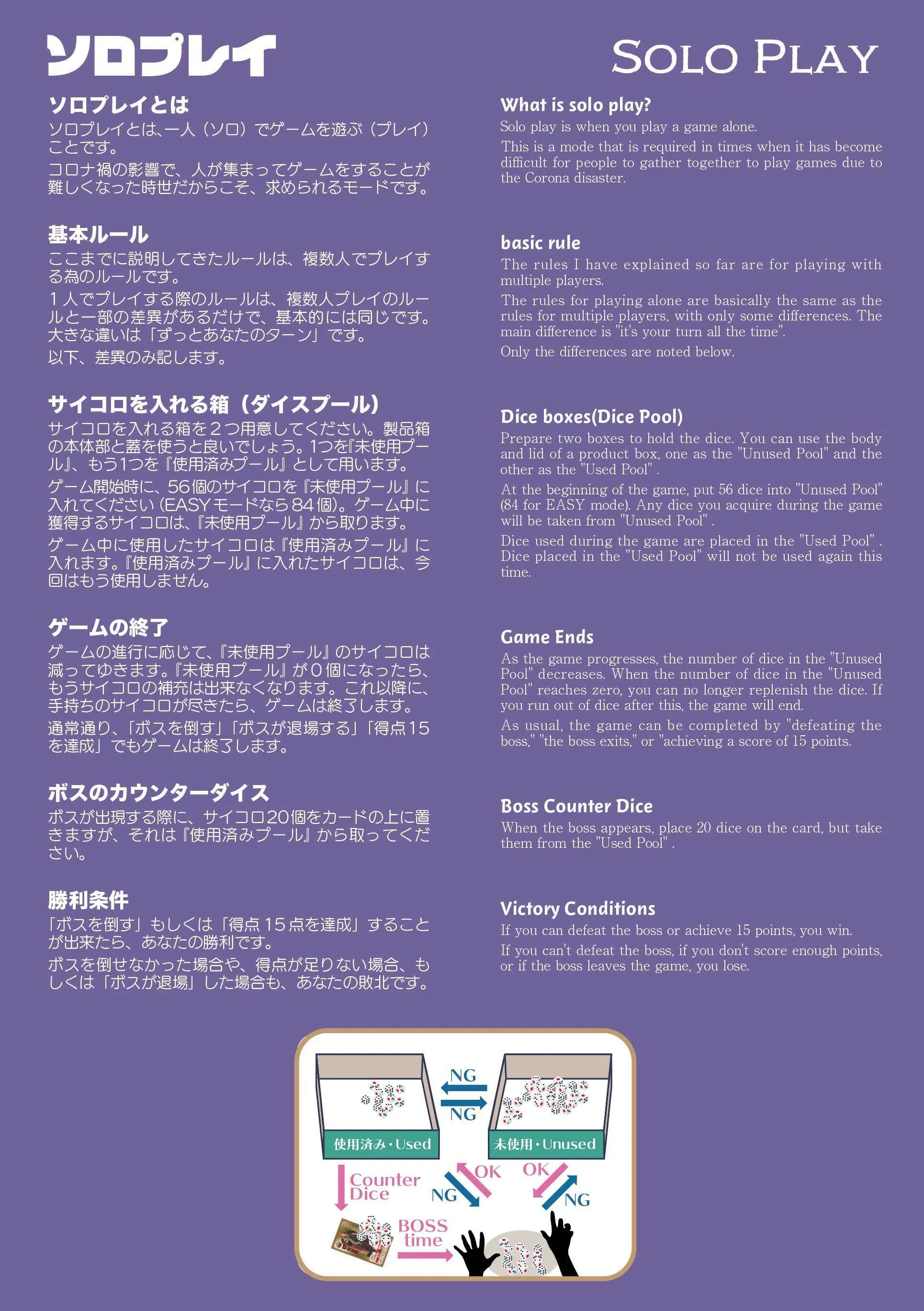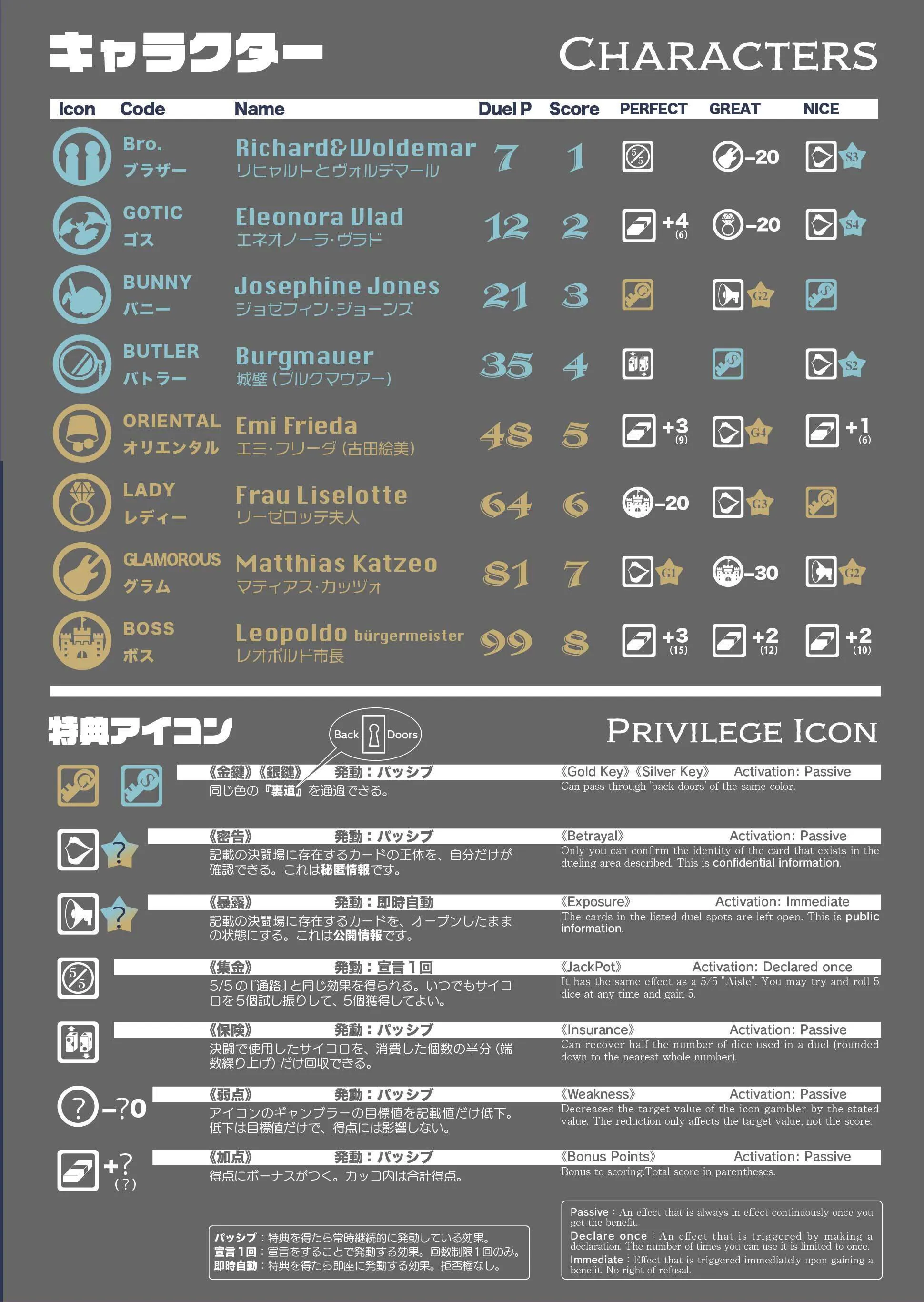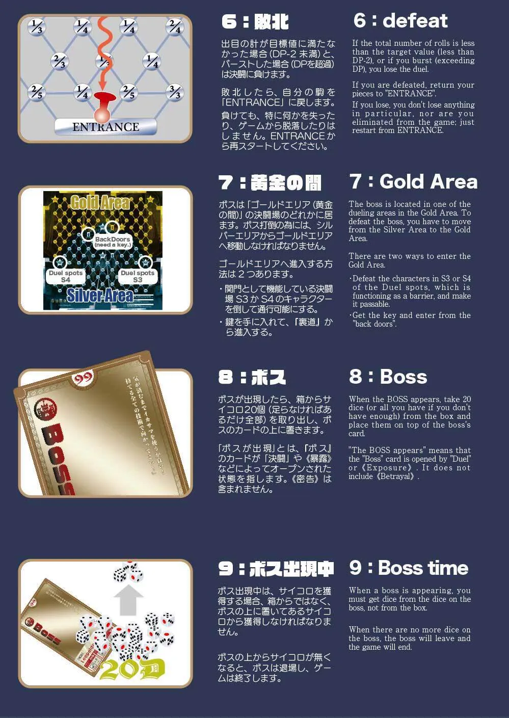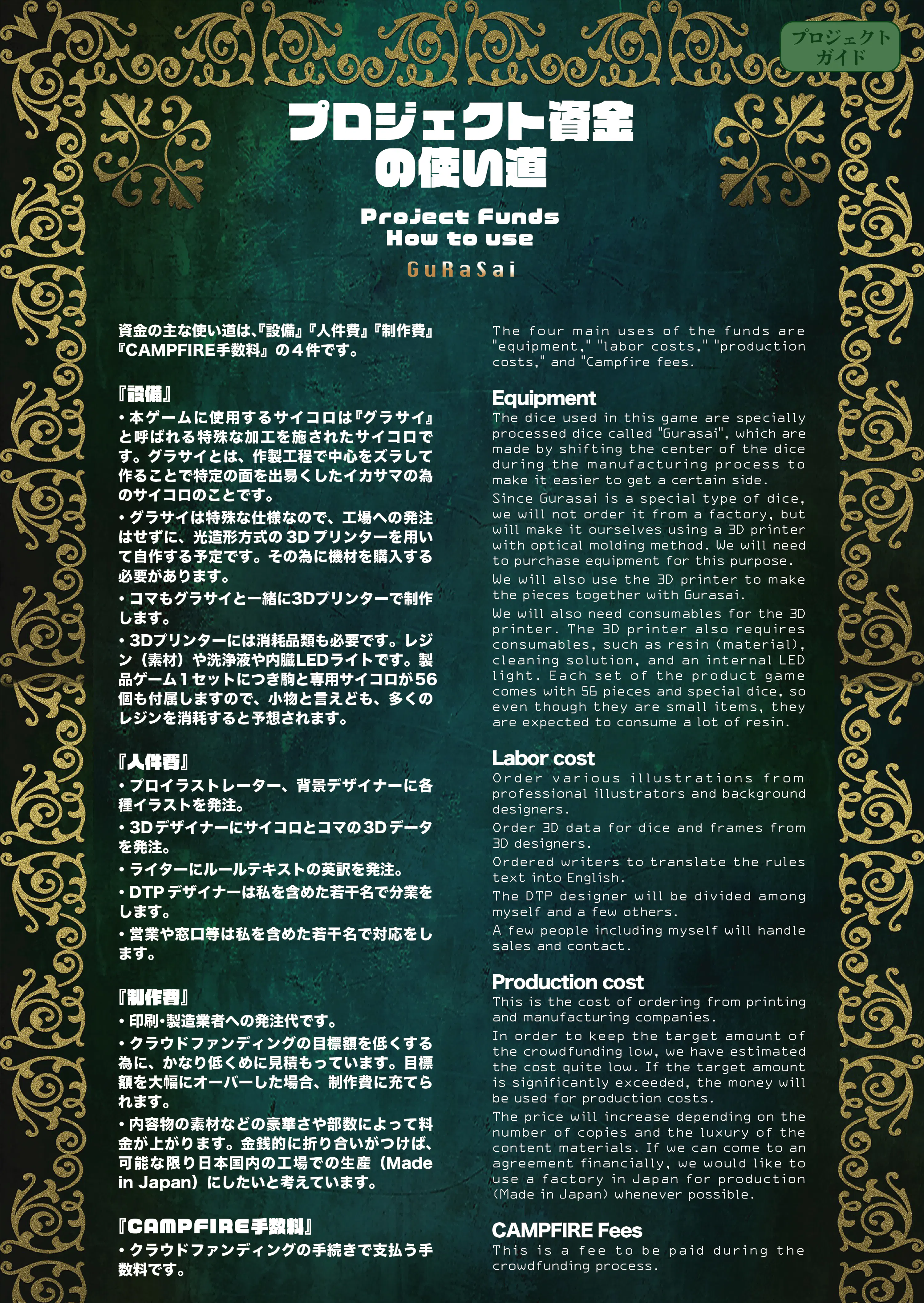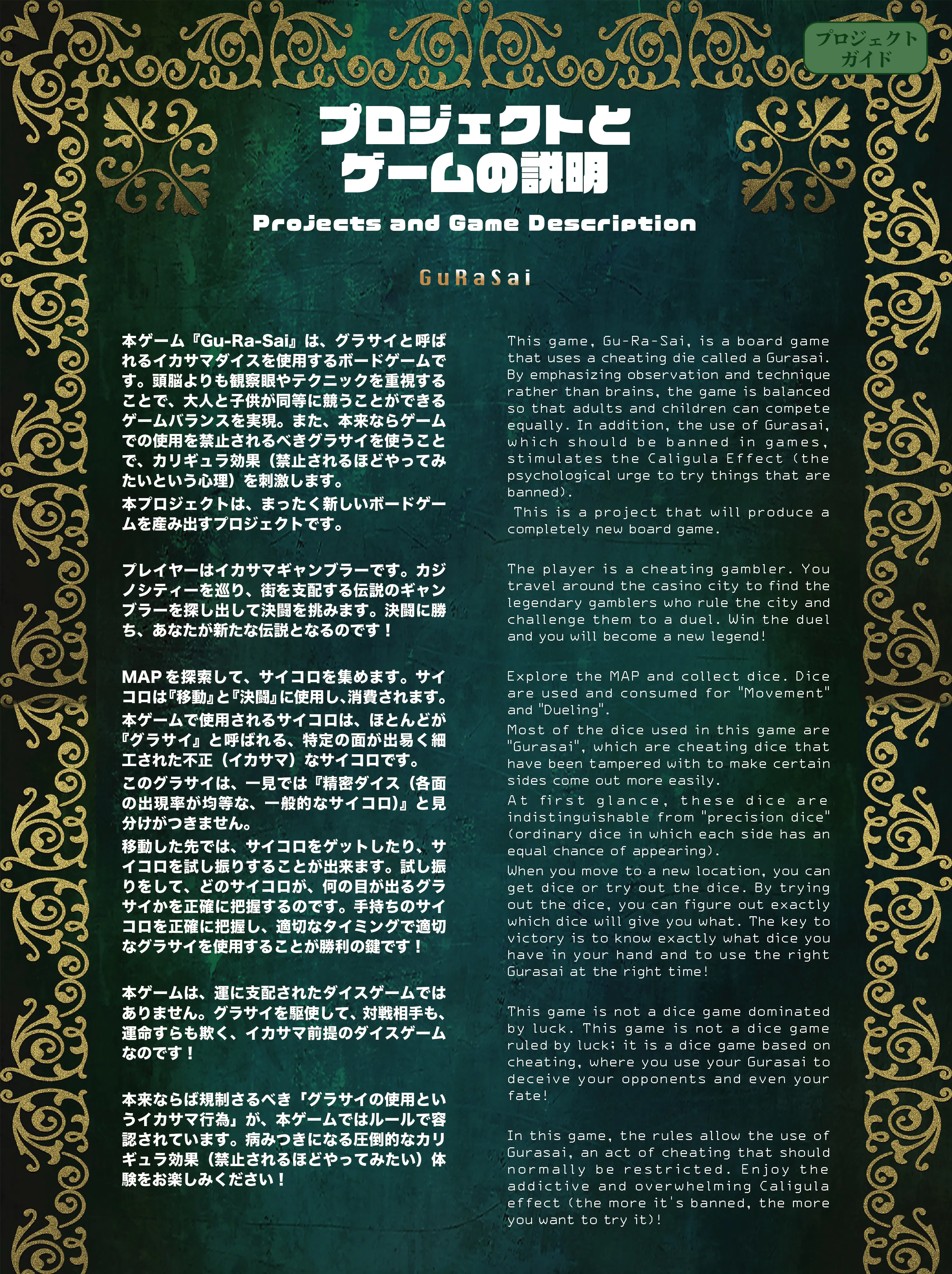 2021/05/09 07:47「何をするゲームか?」をホームで早い段階で示して欲しい、というご意見を戴きました。I've been asked to indicate early on at home, "What's the game about? We received a suggestion to show "what the game is about" early on at home.TOPイメージの4枚目と、ホームの中程には該当の画像を掲載していたのですが、確かに言われる通り、最優先に近い優先度で表示した方が概要を掴み易いですね。I had posted the 4th image on the top image and the corresponding image in the middle of the home page, but as you said, it would be easier to grasp the overview if it was displayed with priority near the top.掲載順番を差し替えようと思いますが、更新する為にはCAMPFIREの審査が必要であり、反映されるまでに時間が掛かりますので、取り急ぎ、この『活動報告』のページで該当画像をピックアップしておきます。I will replace the order in which the images are posted, but it will take time for CAMPFIRE to review them, so I will pick up the relevant images on the "Activity Report" page as soon as possible.ここはカジノシティー。キミは余所者のイカサマギャンブラー。街の支配者・ボスである伝説のギャンブラーを倒す為、この街に来ました。立ちはだかる刺客ギャンブラーたち。奴らをグラサイ(イカサマ仕様サイコロ)で返り討ちにして、ボスの居処を吐かせましょう。ボスを探し出し、決闘を挑んで倒す! キミがこの街の新たな伝説となるのです!1)サイコロを集める!2)刺客を倒す!3)ボスの居場所を吐かせる!4)ボスを倒す!◆基本情報1人〜4人(基本セット)・ソロプレイ可能なので、おひとりでも気軽に遊べます。・拡張セットなら、最大6人まで同時プレイが可能。20〜45分 が、プレイ時間の大体の目安です。・ソロプレイなら15分以内。・複数人でのプレイ時間は、早くて「プレイヤー人数×5分 +5分」、長くても「プレイヤー人数×10分 +10分」ぐらいとなります。ゲームに慣れていない場合は、さらに+15分ぐらいかかるかもしれません。・最短ルート(GOTHIC → ORIENTAL)が成功すれば、10分でクリアが可能です。8歳〜大人・子供でも理解できるシンプルルール。・大人の嗜好にも耐え得る、駆け引きと戦術。・子供と大人が対等に競えるので、ファミリーゲームとしてお楽しみ頂けます。グラサイとは、内部に細工を施したサイコロのことです。重心を調整して特定の面を出易くした、イカサマの為のサイコロです。特製のグラサイ48個に精密ダイス8個を含む計56個のサイコロが封入されています。普通のサイコロと見た目では区別できません。どの面が出易いグラサイなのかは、試し振りで判断するしかありません。移動でも決闘でもサイコロを振る際に、どの目が出るかが予め判っていれば、圧倒的に有利に立ち回れます。どのサイコロがどの面が出易いかを正確に把握して、適切なタイミングで使用する観察眼と勝負勘が、本ゲームの必勝法です。従来のゲームでは禁止されるイカサマ専用ダイスを堂々と振る。カリギュラ体験!「禁止されるほどやってみたい」という心理。それがカリギュラ効果です。従来のゲームでは使用を禁止されるであろうグラサイ(イカサマ専用サイコロ)の使用を敢えてルールで認めたイカサマ勝負!甘美的なカリギュラ効果をご体験ください。子供は観察と勘で!大人は経験と駆け引きで!子供と大人が対等に競えます。ファミリーゲームとしてもお楽しみ頂けます。サイコロの正体を見極めよう!サイコロの出目を支配すれば百戦殆うからず!強い刺客に勝つには、多くのサイコロが必要!得点の高い強敵を倒そう!1)サイコロを振ってMAPを移動します。移動先のマスで、サイコロの『試し振り』と、サイコロの『獲得』が出来ます。2)サイコロは『移動』と『決闘』に使用しますが、『試し振り』以外で使用したサイコロは消費します(箱に戻します)ので、常にサイコロを『獲得』して多く保つ必要があります。3)『獲得』したサイコロが、どんなグラサイか精密ダイスかは、振って判断するしかありません。『試し振り』で不明なサイコロの正体を確認します。4)MAPのデュエルスポット(決闘場)に辿り着くと、敵ギャンブラーとの決闘です。勝てば、得点と「ボスの居場所に関する情報」などの特典が得られます。勝ち様(PERFECT、GREAT、NICE)も特典に影響します。5)ボスを探し出して決闘します。勝てば大量得点を得て、ゲームは終了です。6)最終的に、もっとも得点を多く獲得したプレイヤーが勝者であり、伝説となります。 もっと見る