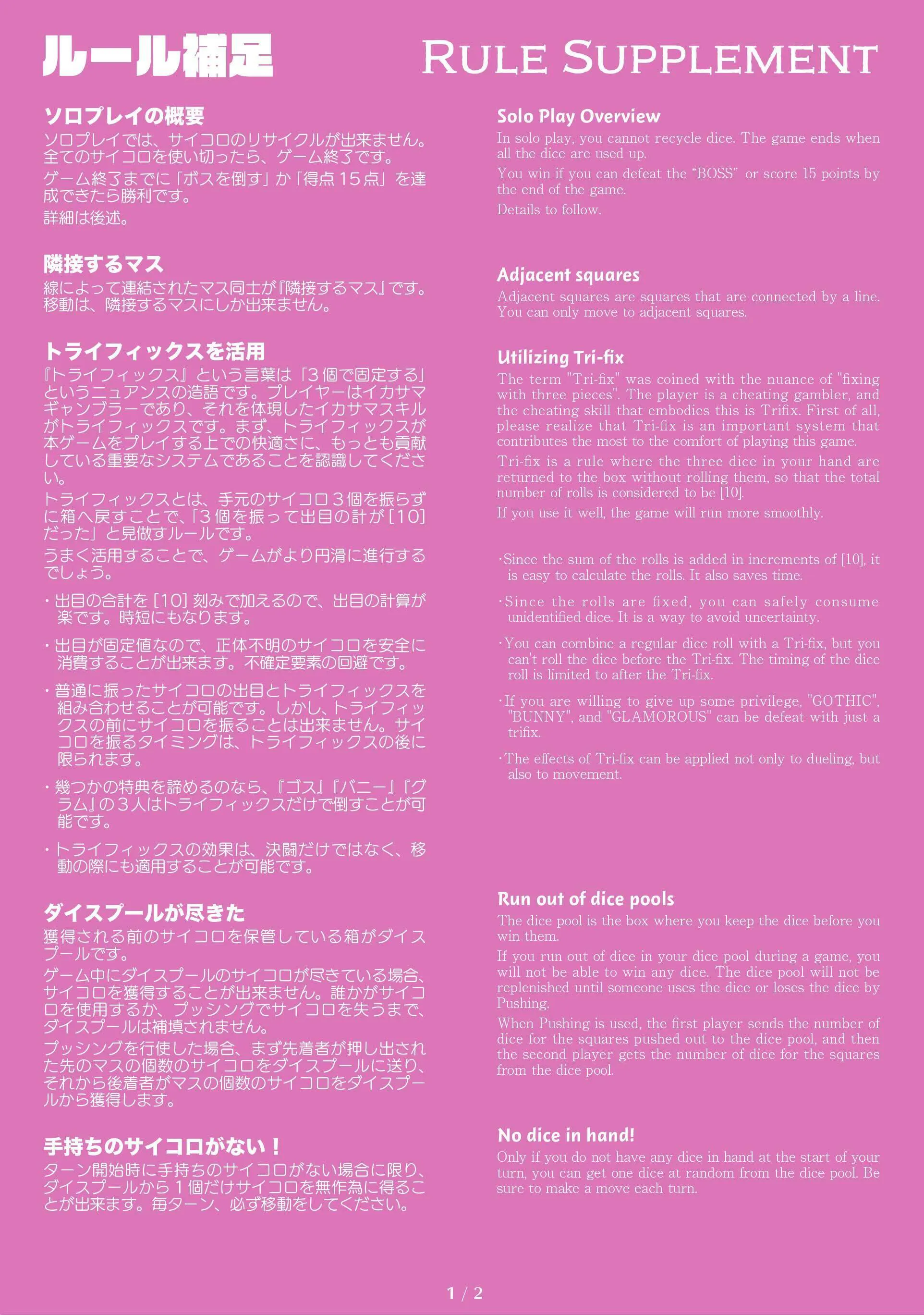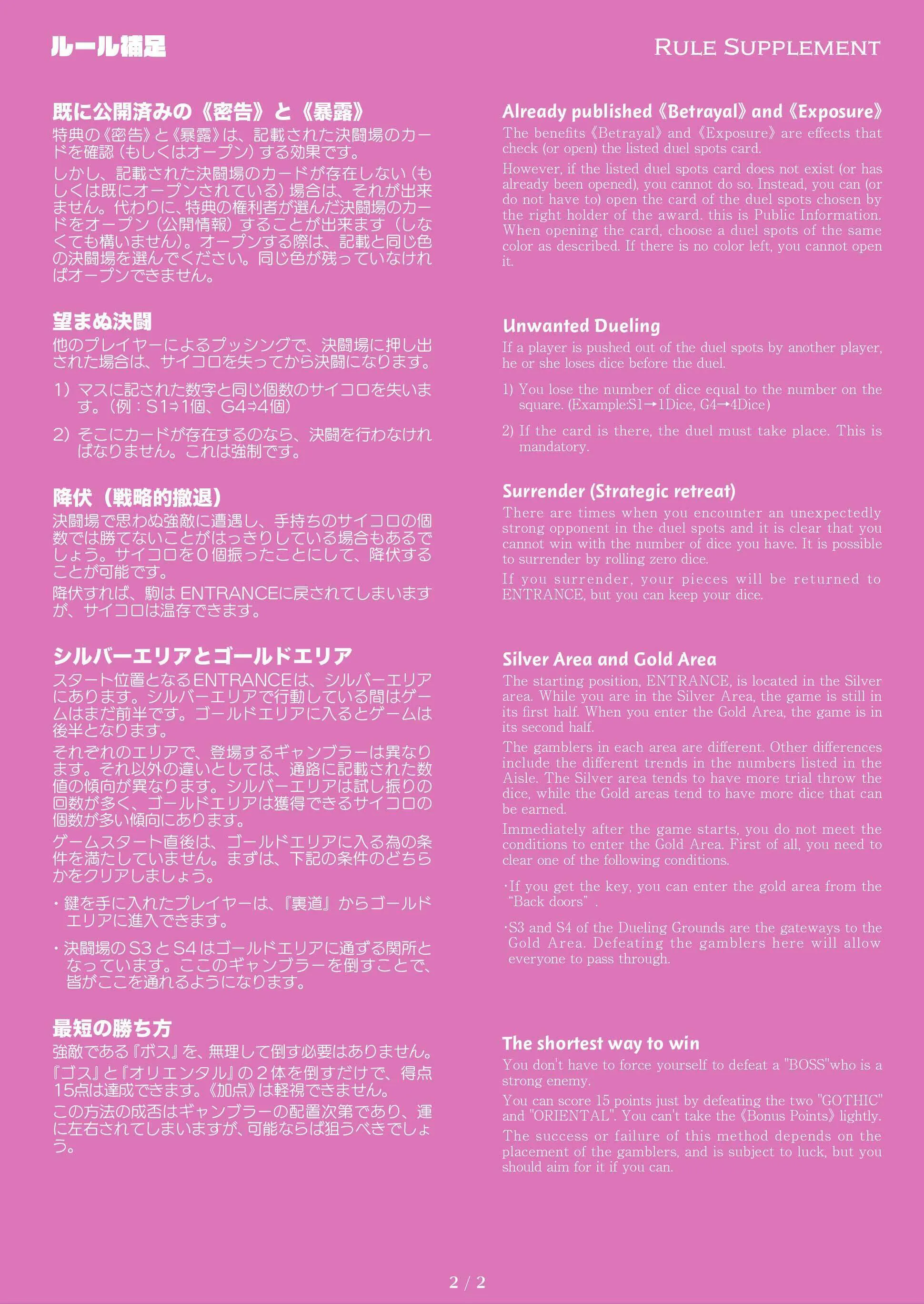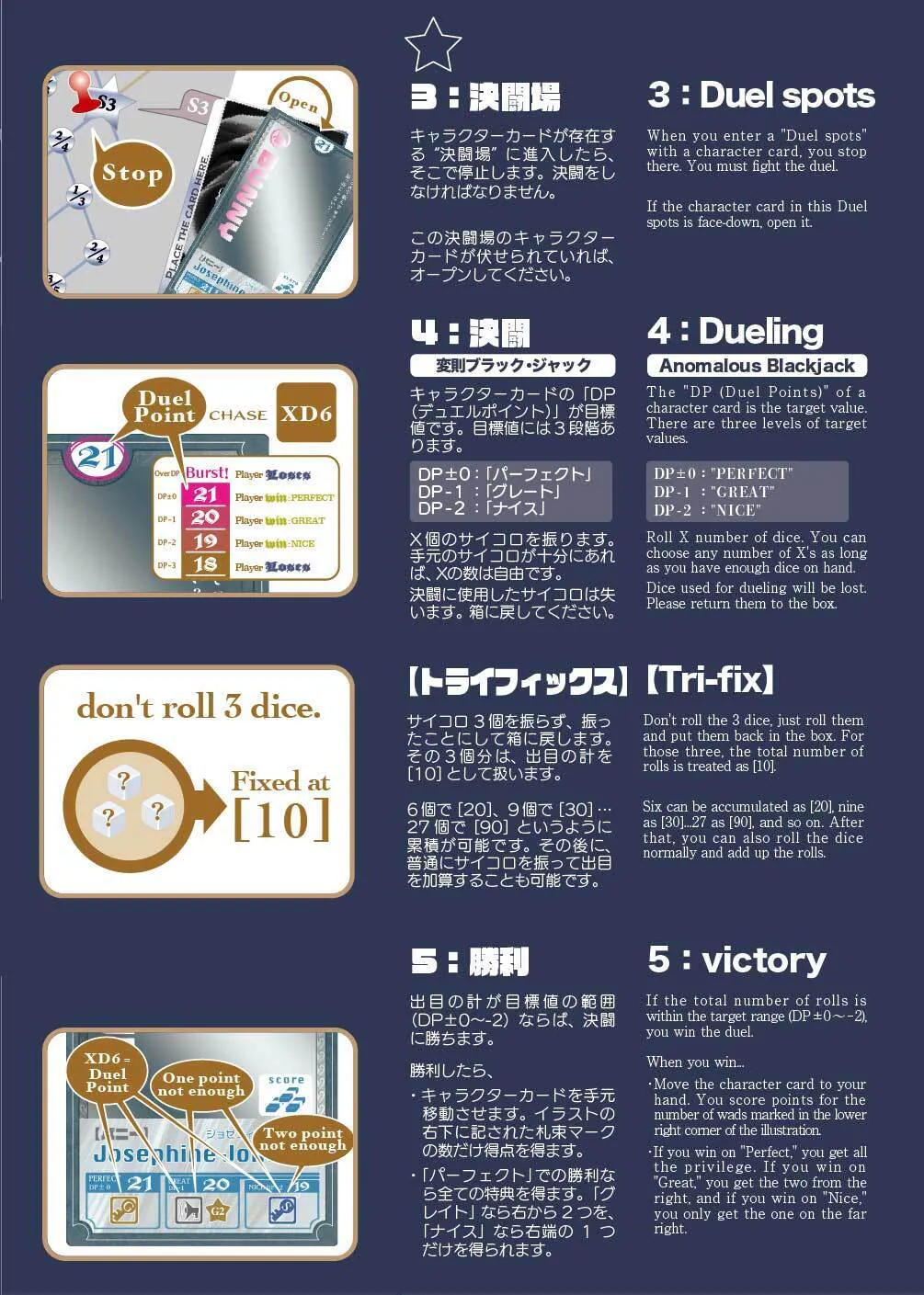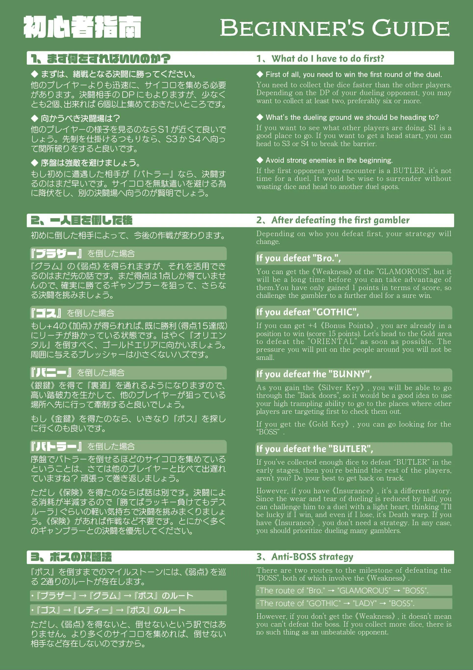 2021/05/09 07:47「何をするゲームか?」をホームで早い段階で示して欲しい、というご意見を戴きました。I've been asked to indicate early on at home, "What's the game about? We received a suggestion to show "what the game is about" early on at home.TOPイメージの4枚目と、ホームの中程には該当の画像を掲載していたのですが、確かに言われる通り、最優先に近い優先度で表示した方が概要を掴み易いですね。I had posted the 4th image on the top image and the corresponding image in the middle of the home page, but as you said, it would be easier to grasp the overview if it was displayed with priority near the top.掲載順番を差し替えようと思いますが、更新する為にはCAMPFIREの審査が必要であり、反映されるまでに時間が掛かりますので、取り急ぎ、この『活動報告』のページで該当画像をピックアップしておきます。I will replace the order in which the images are posted, but it will take time for CAMPFIRE to review them, so I will pick up the relevant images on the "Activity Report" page as soon as possible.ここはカジノシティー。キミは余所者のイカサマギャンブラー。街の支配者・ボスである伝説のギャンブラーを倒す為、この街に来ました。立ちはだかる刺客ギャンブラーたち。奴らをグラサイ(イカサマ仕様サイコロ)で返り討ちにして、ボスの居処を吐かせましょう。ボスを探し出し、決闘を挑んで倒す! キミがこの街の新たな伝説となるのです!1)サイコロを集める!2)刺客を倒す!3)ボスの居場所を吐かせる!4)ボスを倒す!◆基本情報1人〜4人(基本セット)・ソロプレイ可能なので、おひとりでも気軽に遊べます。・拡張セットなら、最大6人まで同時プレイが可能。20〜45分 が、プレイ時間の大体の目安です。・ソロプレイなら15分以内。・複数人でのプレイ時間は、早くて「プレイヤー人数×5分 +5分」、長くても「プレイヤー人数×10分 +10分」ぐらいとなります。ゲームに慣れていない場合は、さらに+15分ぐらいかかるかもしれません。・最短ルート(GOTHIC → ORIENTAL)が成功すれば、10分でクリアが可能です。8歳〜大人・子供でも理解できるシンプルルール。・大人の嗜好にも耐え得る、駆け引きと戦術。・子供と大人が対等に競えるので、ファミリーゲームとしてお楽しみ頂けます。グラサイとは、内部に細工を施したサイコロのことです。重心を調整して特定の面を出易くした、イカサマの為のサイコロです。特製のグラサイ48個に精密ダイス8個を含む計56個のサイコロが封入されています。普通のサイコロと見た目では区別できません。どの面が出易いグラサイなのかは、試し振りで判断するしかありません。移動でも決闘でもサイコロを振る際に、どの目が出るかが予め判っていれば、圧倒的に有利に立ち回れます。どのサイコロがどの面が出易いかを正確に把握して、適切なタイミングで使用する観察眼と勝負勘が、本ゲームの必勝法です。従来のゲームでは禁止されるイカサマ専用ダイスを堂々と振る。カリギュラ体験!「禁止されるほどやってみたい」という心理。それがカリギュラ効果です。従来のゲームでは使用を禁止されるであろうグラサイ(イカサマ専用サイコロ)の使用を敢えてルールで認めたイカサマ勝負!甘美的なカリギュラ効果をご体験ください。子供は観察と勘で!大人は経験と駆け引きで!子供と大人が対等に競えます。ファミリーゲームとしてもお楽しみ頂けます。サイコロの正体を見極めよう!サイコロの出目を支配すれば百戦殆うからず!強い刺客に勝つには、多くのサイコロが必要!得点の高い強敵を倒そう!1)サイコロを振ってMAPを移動します。移動先のマスで、サイコロの『試し振り』と、サイコロの『獲得』が出来ます。2)サイコロは『移動』と『決闘』に使用しますが、『試し振り』以外で使用したサイコロは消費します(箱に戻します)ので、常にサイコロを『獲得』して多く保つ必要があります。3)『獲得』したサイコロが、どんなグラサイか精密ダイスかは、振って判断するしかありません。『試し振り』で不明なサイコロの正体を確認します。4)MAPのデュエルスポット(決闘場)に辿り着くと、敵ギャンブラーとの決闘です。勝てば、得点と「ボスの居場所に関する情報」などの特典が得られます。勝ち様(PERFECT、GREAT、NICE)も特典に影響します。5)ボスを探し出して決闘します。勝てば大量得点を得て、ゲームは終了です。6)最終的に、もっとも得点を多く獲得したプレイヤーが勝者であり、伝説となります。 もっと見る