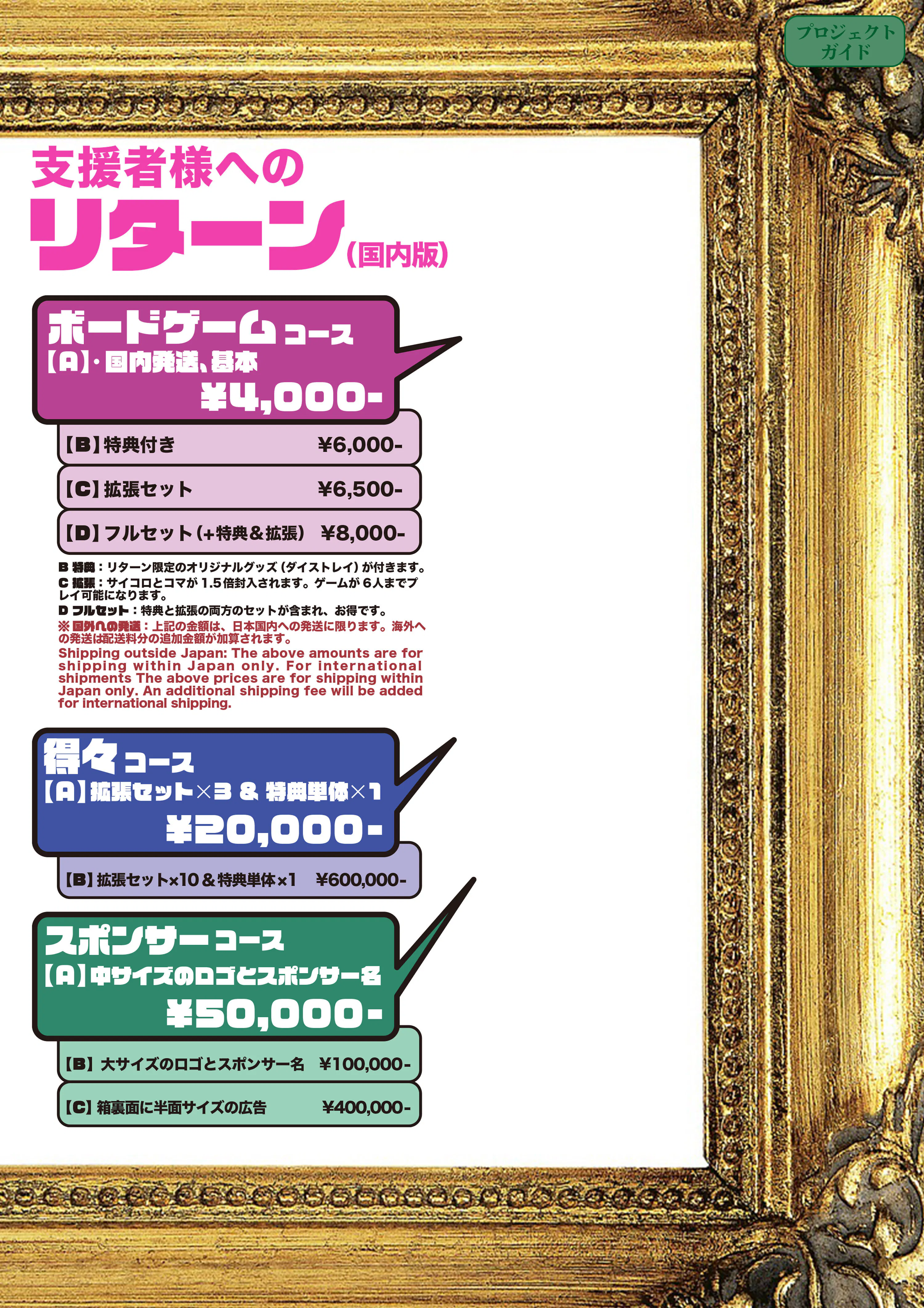 ・お勧めは『ボードゲームコース【D】フルセット(8,000円)』です。ボリューム的にも、ご満足頂けるリターンです。