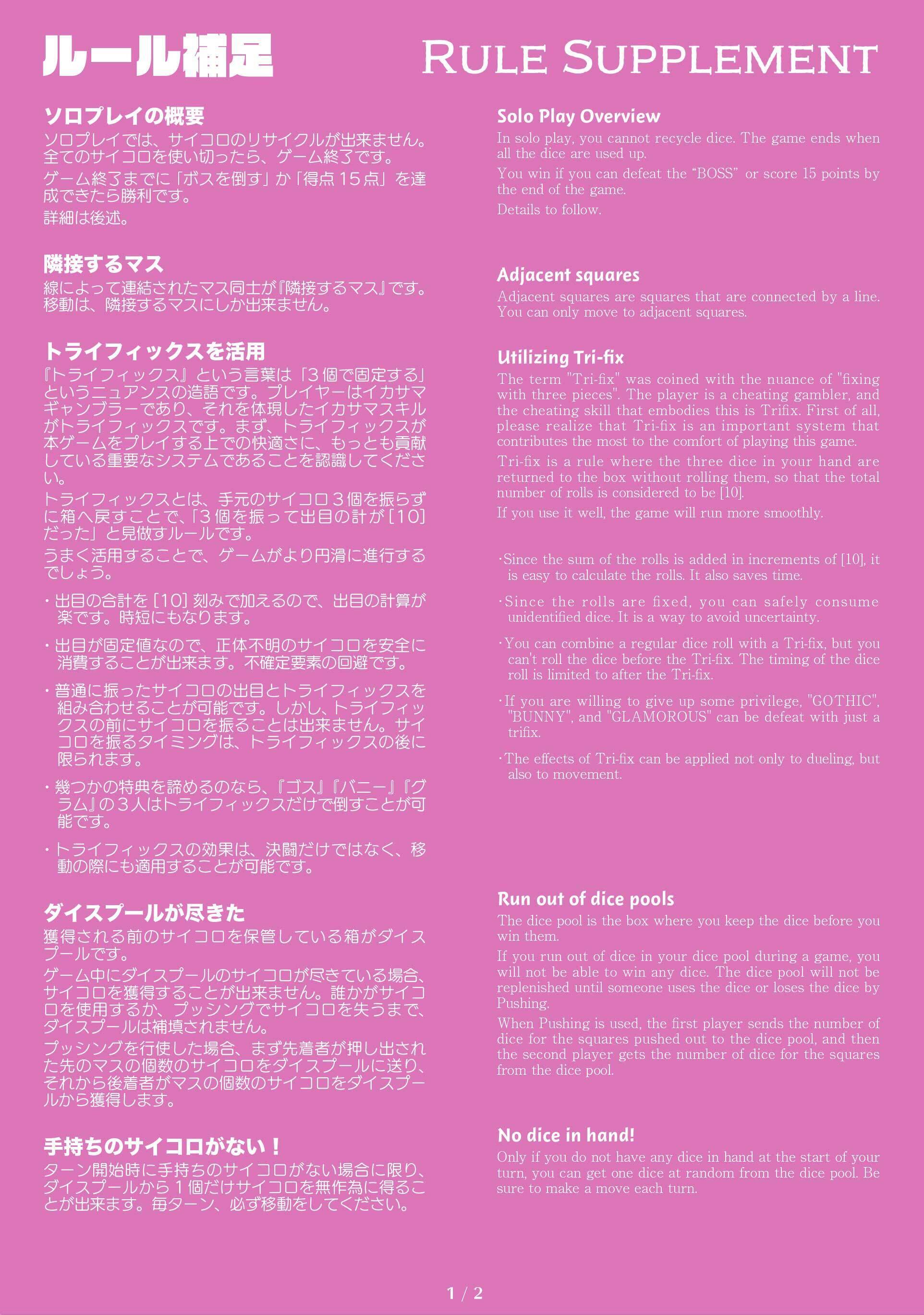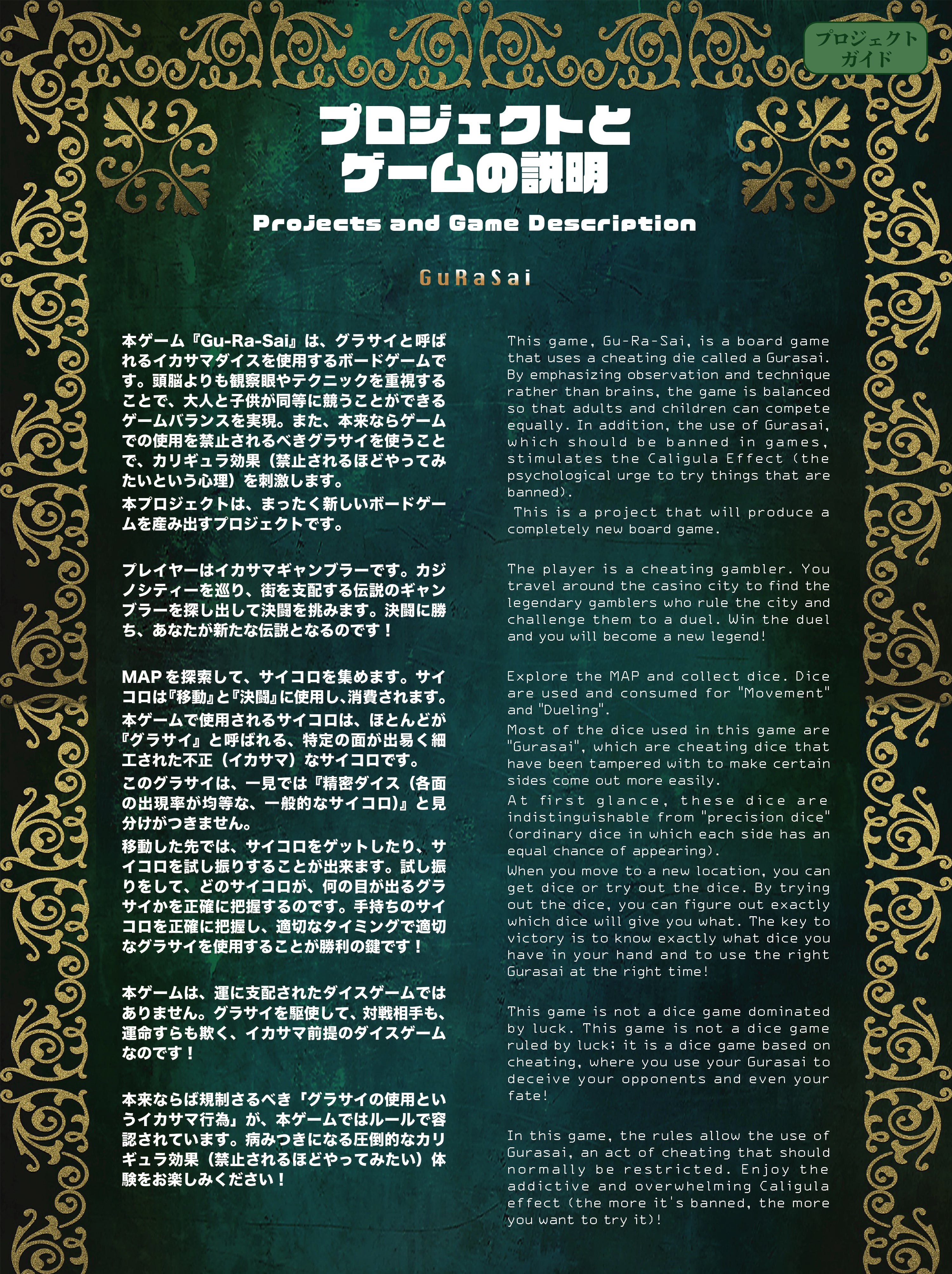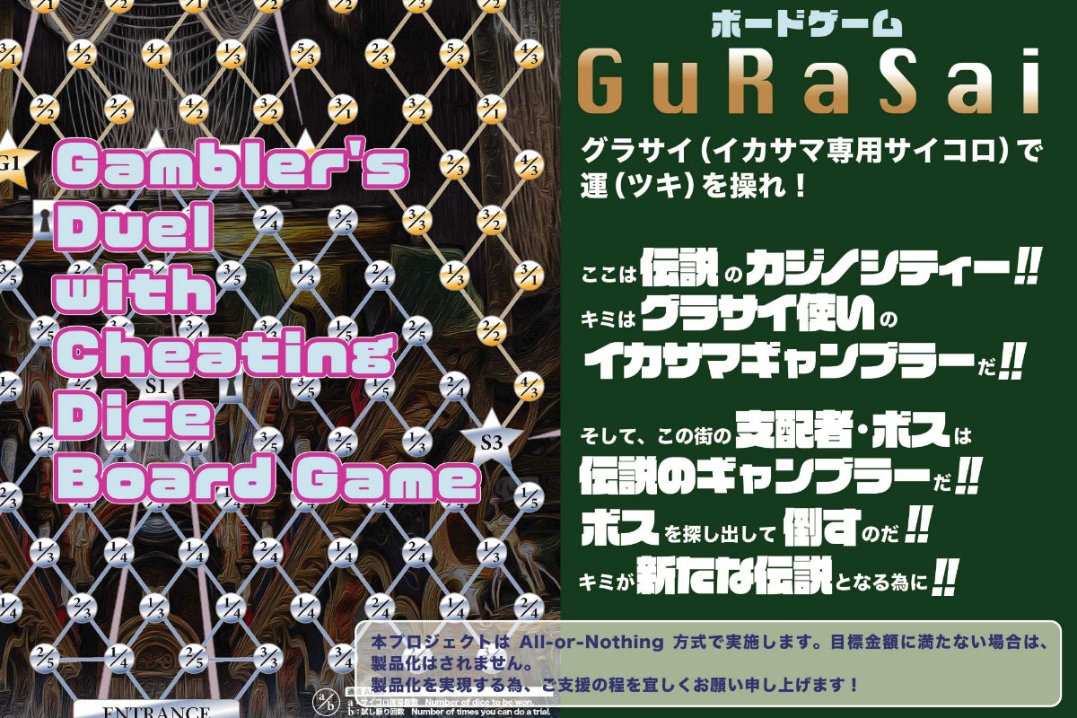 2021/05/09 07:47「何をするゲームか?」をホームで早い段階で示して欲しい、というご意見を戴きました。I've been asked to indicate early on at home, "What's the game about? We received a suggestion to show "what the game is about" early on at home.TOPイメージの4枚目と、ホームの中程には該当の画像を掲載していたのですが、確かに言われる通り、最優先に近い優先度で表示した方が概要を掴み易いですね。I had posted the 4th image on the top image and the corresponding image in the middle of the home page, but as you said, it would be easier to grasp the overview if it was displayed with priority near the top.掲載順番を差し替えようと思いますが、更新する為にはCAMPFIREの審査が必要であり、反映されるまでに時間が掛かりますので、取り急ぎ、この『活動報告』のページで該当画像をピックアップしておきます。I will replace the order in which the images are posted, but it will take time for CAMPFIRE to review them, so I will pick up the relevant images on the "Activity Report" page as soon as possible.ここはカジノシティー。キミは余所者のイカサマギャンブラー。街の支配者・ボスである伝説のギャンブラーを倒す為、この街に来ました。立ちはだかる刺客ギャンブラーたち。奴らをグラサイ(イカサマ仕様サイコロ)で返り討ちにして、ボスの居処を吐かせましょう。ボスを探し出し、決闘を挑んで倒す! キミがこの街の新たな伝説となるのです!1)サイコロを集める!2)刺客を倒す!3)ボスの居場所を吐かせる!4)ボスを倒す!◆基本情報1人〜4人(基本セット)・ソロプレイ可能なので、おひとりでも気軽に遊べます。・拡張セットなら、最大6人まで同時プレイが可能。20〜45分 が、プレイ時間の大体の目安です。・ソロプレイなら15分以内。・複数人でのプレイ時間は、早くて「プレイヤー人数×5分 +5分」、長くても「プレイヤー人数×10分 +10分」ぐらいとなります。ゲームに慣れていない場合は、さらに+15分ぐらいかかるかもしれません。・最短ルート(GOTHIC → ORIENTAL)が成功すれば、10分でクリアが可能です。8歳〜大人・子供でも理解できるシンプルルール。・大人の嗜好にも耐え得る、駆け引きと戦術。・子供と大人が対等に競えるので、ファミリーゲームとしてお楽しみ頂けます。グラサイとは、内部に細工を施したサイコロのことです。重心を調整して特定の面を出易くした、イカサマの為のサイコロです。特製のグラサイ48個に精密ダイス8個を含む計56個のサイコロが封入されています。普通のサイコロと見た目では区別できません。どの面が出易いグラサイなのかは、試し振りで判断するしかありません。移動でも決闘でもサイコロを振る際に、どの目が出るかが予め判っていれば、圧倒的に有利に立ち回れます。どのサイコロがどの面が出易いかを正確に把握して、適切なタイミングで使用する観察眼と勝負勘が、本ゲームの必勝法です。従来のゲームでは禁止されるイカサマ専用ダイスを堂々と振る。カリギュラ体験!「禁止されるほどやってみたい」という心理。それがカリギュラ効果です。従来のゲームでは使用を禁止されるであろうグラサイ(イカサマ専用サイコロ)の使用を敢えてルールで認めたイカサマ勝負!甘美的なカリギュラ効果をご体験ください。子供は観察と勘で!大人は経験と駆け引きで!子供と大人が対等に競えます。ファミリーゲームとしてもお楽しみ頂けます。サイコロの正体を見極めよう!サイコロの出目を支配すれば百戦殆うからず!強い刺客に勝つには、多くのサイコロが必要!得点の高い強敵を倒そう!1)サイコロを振ってMAPを移動します。移動先のマスで、サイコロの『試し振り』と、サイコロの『獲得』が出来ます。2)サイコロは『移動』と『決闘』に使用しますが、『試し振り』以外で使用したサイコロは消費します(箱に戻します)ので、常にサイコロを『獲得』して多く保つ必要があります。3)『獲得』したサイコロが、どんなグラサイか精密ダイスかは、振って判断するしかありません。『試し振り』で不明なサイコロの正体を確認します。4)MAPのデュエルスポット(決闘場)に辿り着くと、敵ギャンブラーとの決闘です。勝てば、得点と「ボスの居場所に関する情報」などの特典が得られます。勝ち様(PERFECT、GREAT、NICE)も特典に影響します。5)ボスを探し出して決闘します。勝てば大量得点を得て、ゲームは終了です。6)最終的に、もっとも得点を多く獲得したプレイヤーが勝者であり、伝説となります。 もっと見る