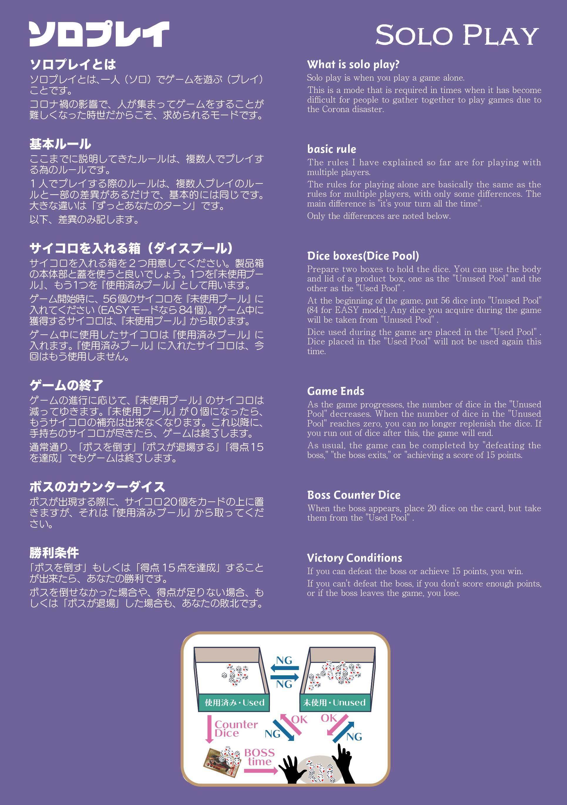 2021/07/23 11:46皆様に応援いただいた当プロジェクトは、目標に達することはできませんでしたが、現在、再チャレンジをしております。▼再チャレンジのプロジェクトURLhttps://camp-fire.jp/projects/view/438440ビジュアル、ゲーム内容ともにパワーアップしての再挑戦です。再度、また応援して頂けますと幸いです。今後とも、宜しくお願い申し上げます。▼試作による試遊風景▼試作サイコロ試作版は紙製ですが、製品版はレジン製のサイコロになります。▼再チャレンジのプロジェクトURLhttps://camp-fire.jp/projects/view/438440 もっと見る