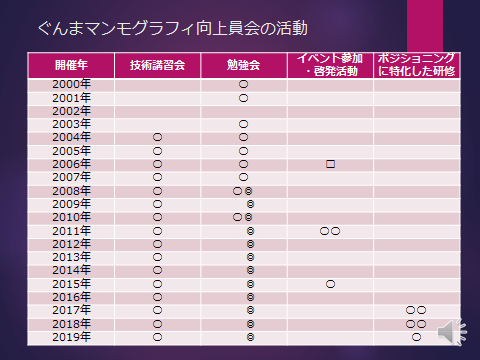 2000年に発足した、群馬県内のマンモグラフィ技術の向上を目的として集まった診療放射線技師の有志(15人)の集まり。マンモグラフィに関する研究や調査を行うだけでなく、講習会の開催や一般の方への乳がんやマンモグラフィに関する啓発活動なども行ってまいりました。
