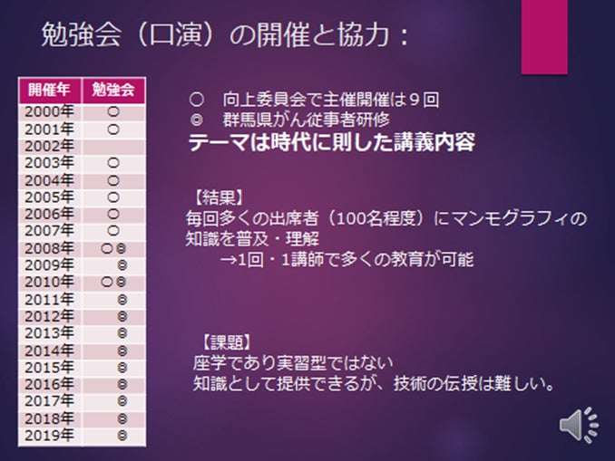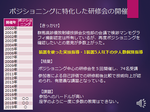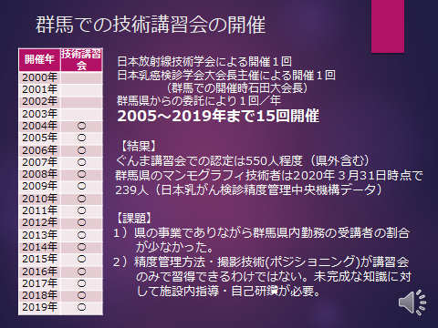 群馬県からの委託を受け、群馬県と日本乳がん検診精度管理中央機構と当会との共催で、2日間にわたるマンモグラフィ技術講習会を2005年から2019年まで15年間にわたり毎年開催してまいりました。受講者は群馬県内だけでなく、北海道から九州まで全国各地からの参加をいただいております。