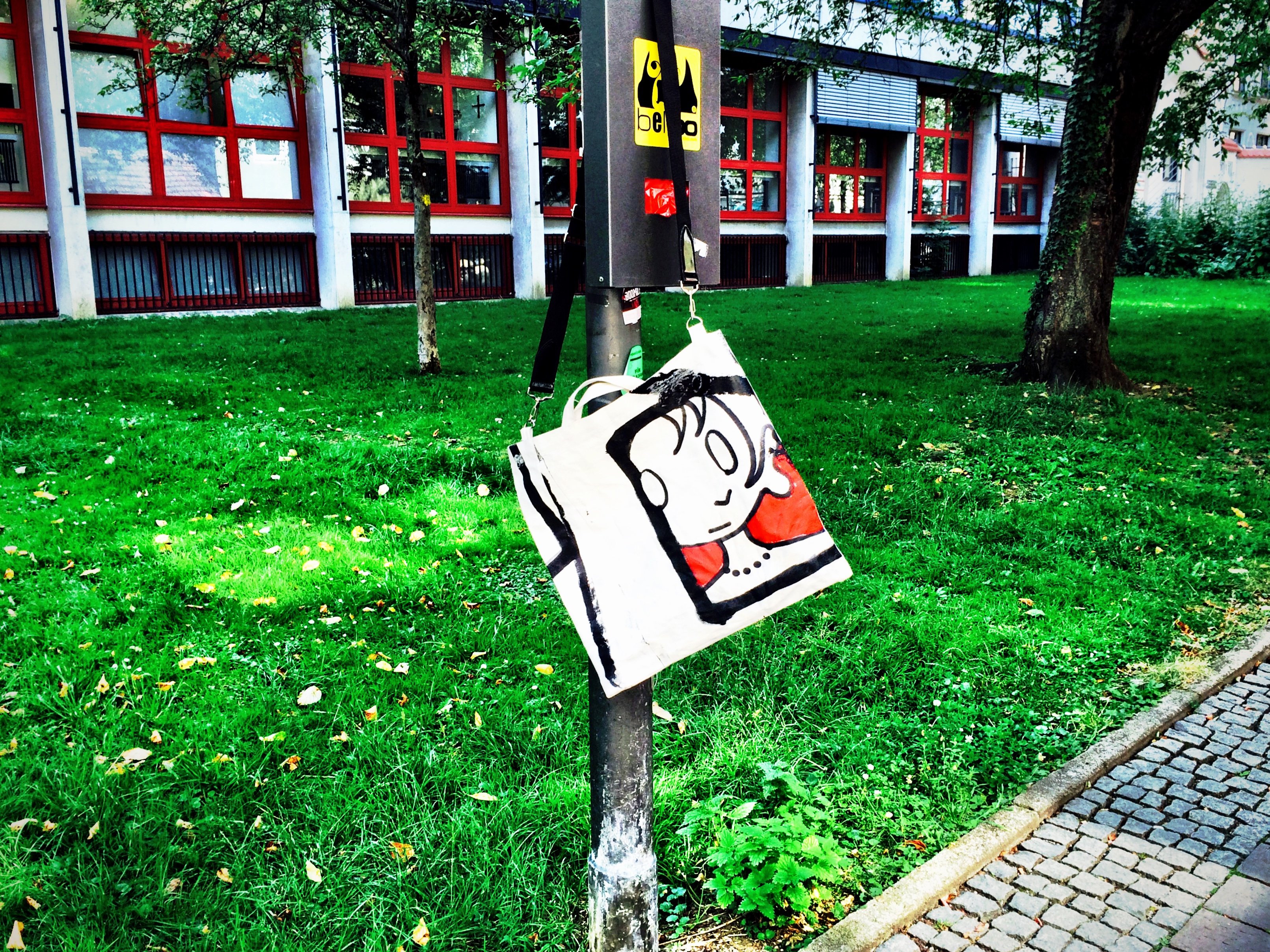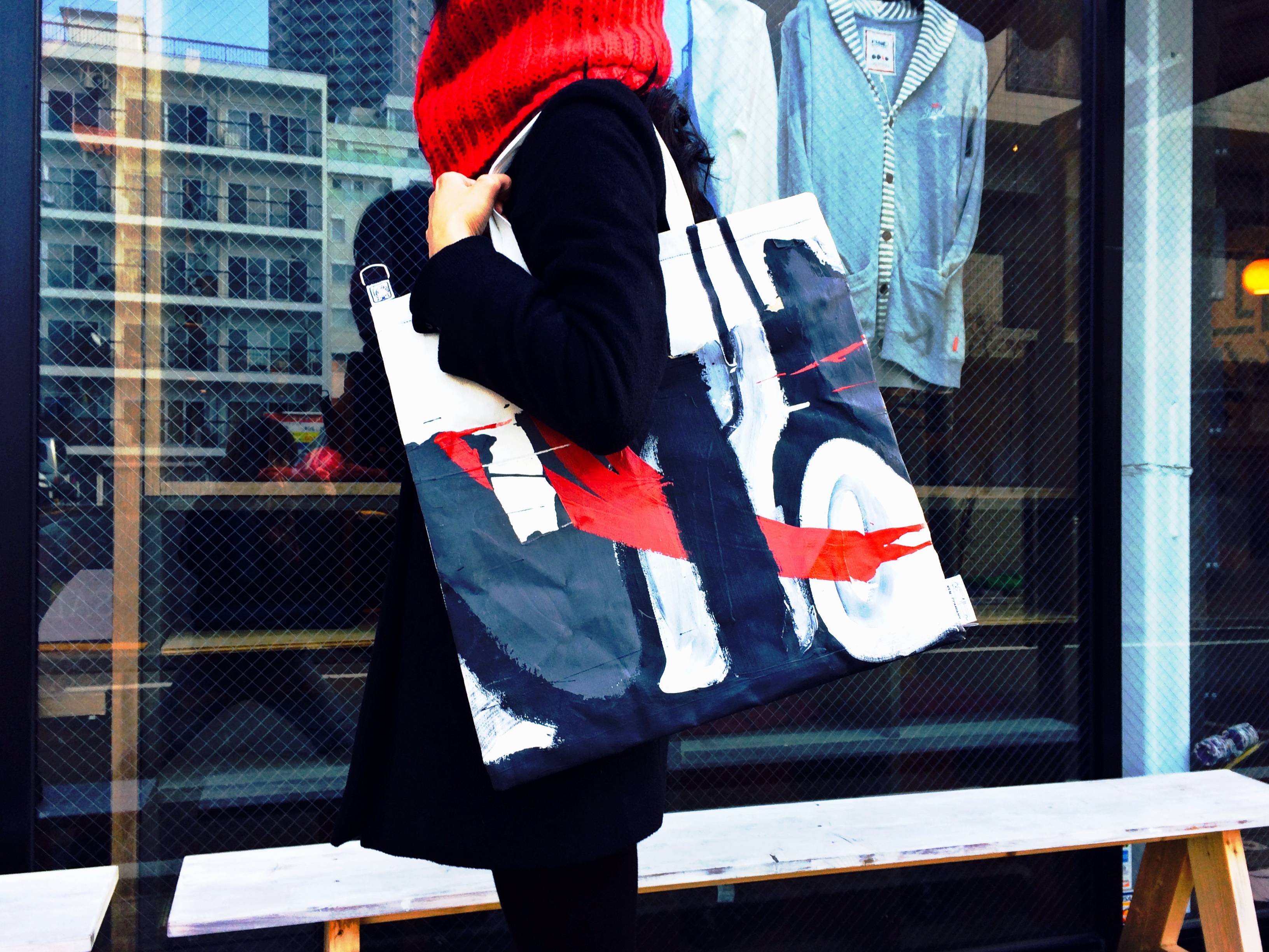 1つ目は、ドローイングされた布を使用してオリジナルバッグの作成。壁に描かれた作品が、プロダクツとして別の形に変わることにより、新たな価値を持ってその後も生き続けていくというコンセプトです。