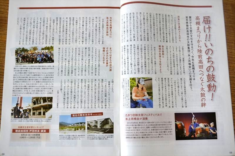 陸前高田市は、和太鼓のイベント「全国太鼓フェスティバル」の開催地。「いのちは鼓動からはじまる」をキャッチフレーズに、毎年全国から和太鼓チームが参加し、元気な太鼓の音を響かせていました。しかし東日本大震災で状況は一変。イベント再開はおろか、復旧の目途も立たない状態。そんな時、津波で約8割が壊滅状態になった同市の太鼓グループ「氷上共鳴会」から、高槻市のグループ「高槻太鼓」の元へメールが届きました。内容は、苦しい現状を伝えるとともに、全国の太鼓グループへの激励、そして「元気な命の鼓動を私たちにください」とのメッセージが。震災直後の自粛ムードの中、「高槻の元気を陸前高田へ」との思いを込め「たかつき和太鼓フェスティバル」を開催しました。