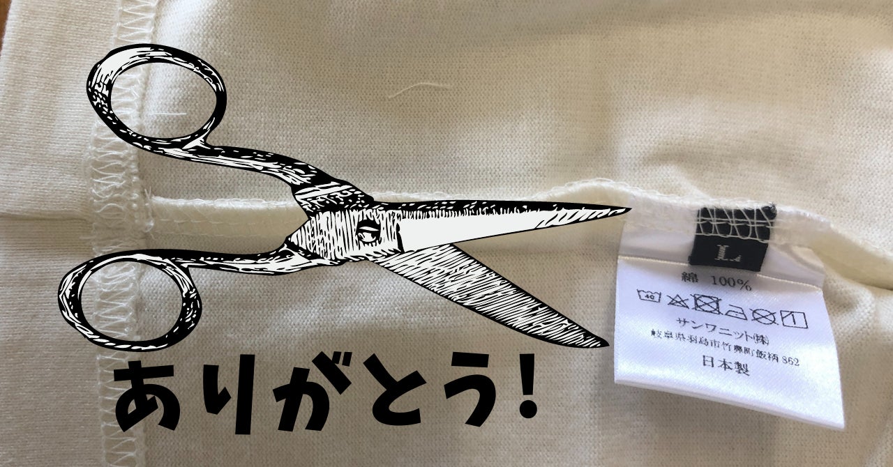エリと脇のタグをはさみでチョキっとハサミで切って