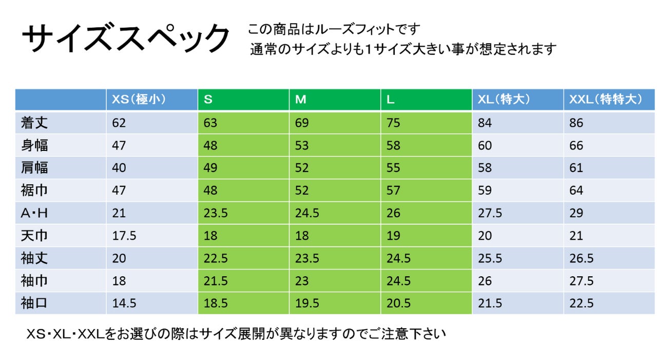 Tシャツのサイズ感ですが、一般的なユニクロTのレギュラーサイズよりも1サイズ大きめとなっております。詳しくは下記表をご参考ください。