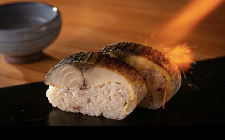 全国各地から、その時期最も脂の乗っている鯖を仕入れ炙り鯖寿司に仕立てています。焼き海苔で巻いて召し上がって頂きます。又、寿司飯には古代米の赤米をブレンドしています。